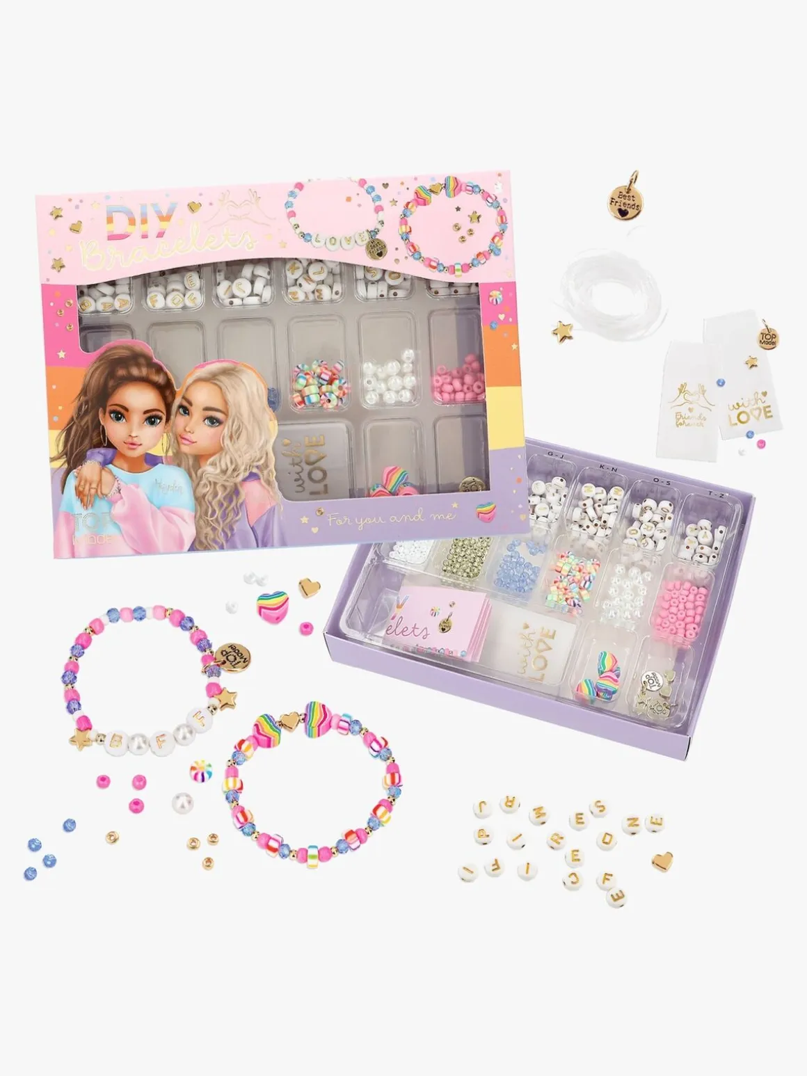 – Indeholder: Farverige perler, bogstavperler, metalcharms, elastisk smykketråd og brugsvejledning.