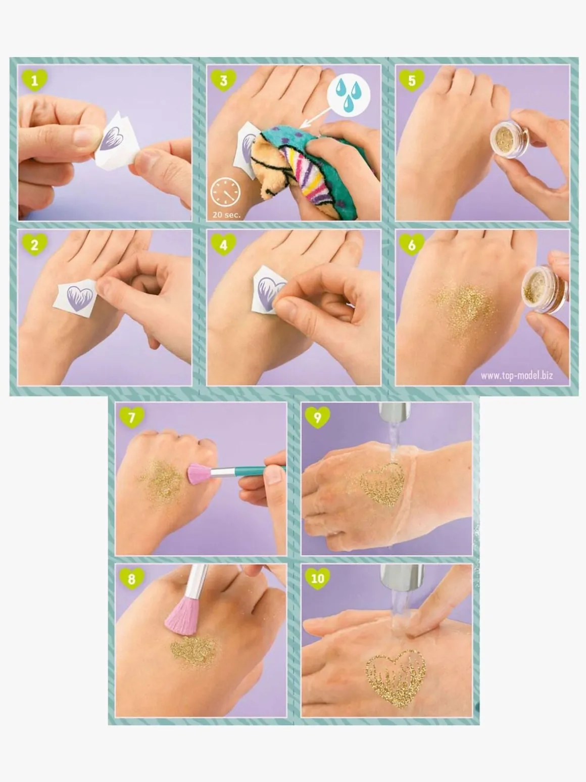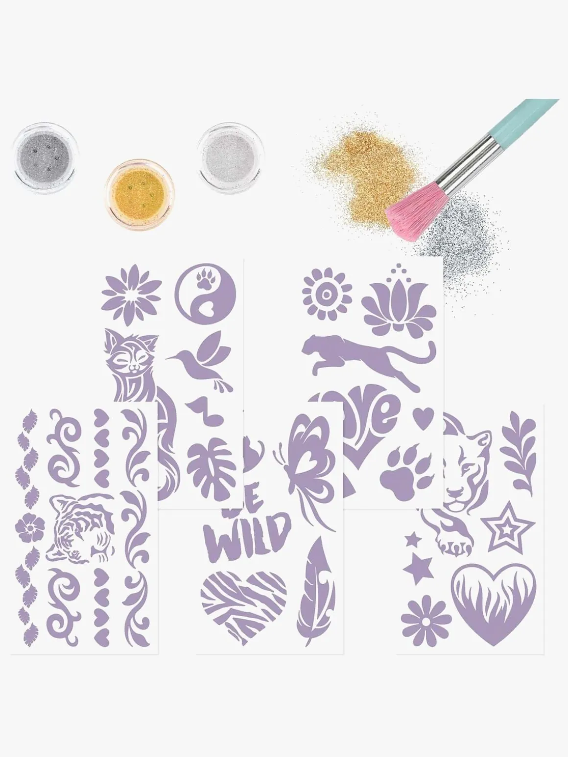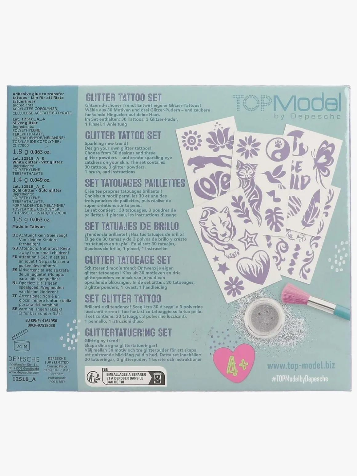 – Indeholder 43 tatoveringer, 3 glitterfarver og 1 pensel.