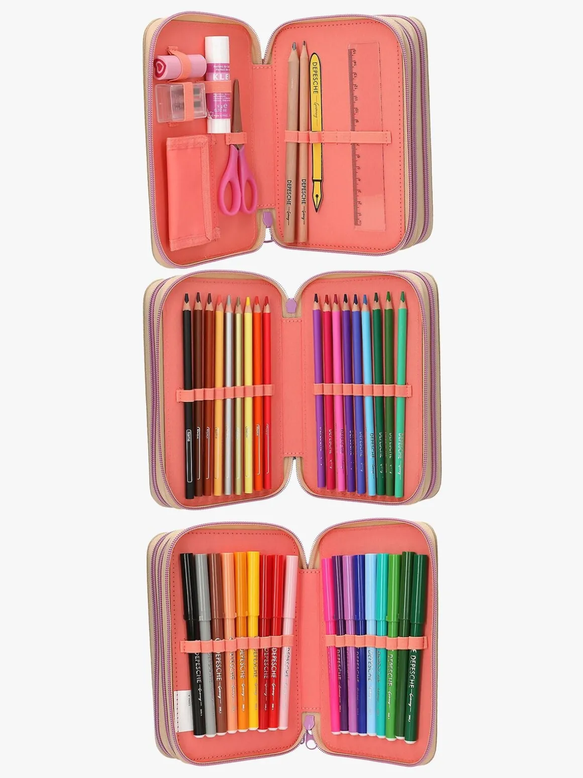 – Indeholder: 1 penalhus, 18 farveblyanter, 18 tusser, 2 blyanter, 1 saks, 1 limstift, 1 blyantspidser, 1 lineal, 1 viskelæder.