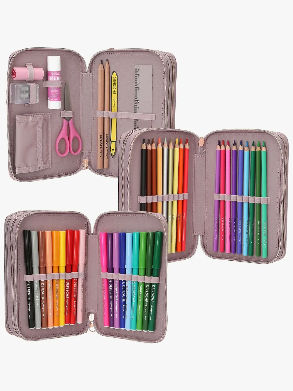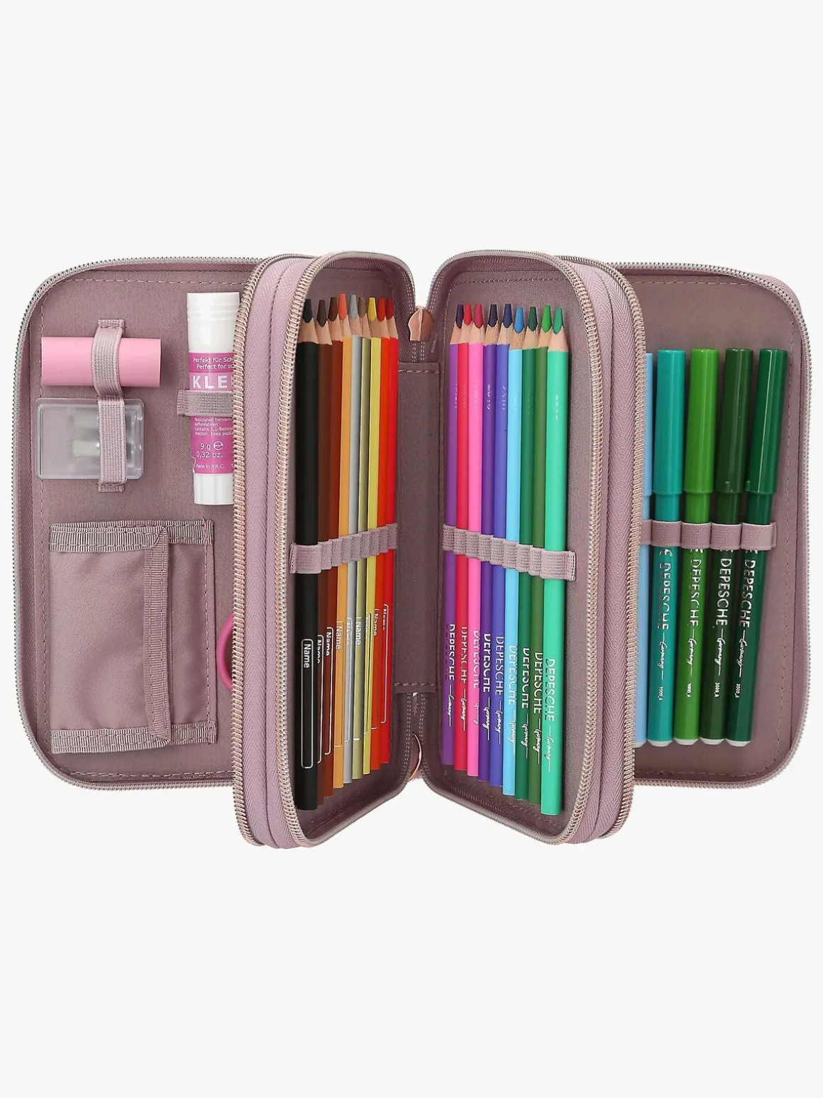 – Indeholder: 1 penalhus, 18 farveblyanter, 18 tusser, 2 blyanter, 1 saks, 1 limstift, 1 blyantspidser, 1 lineal, 1 viskelæder.
