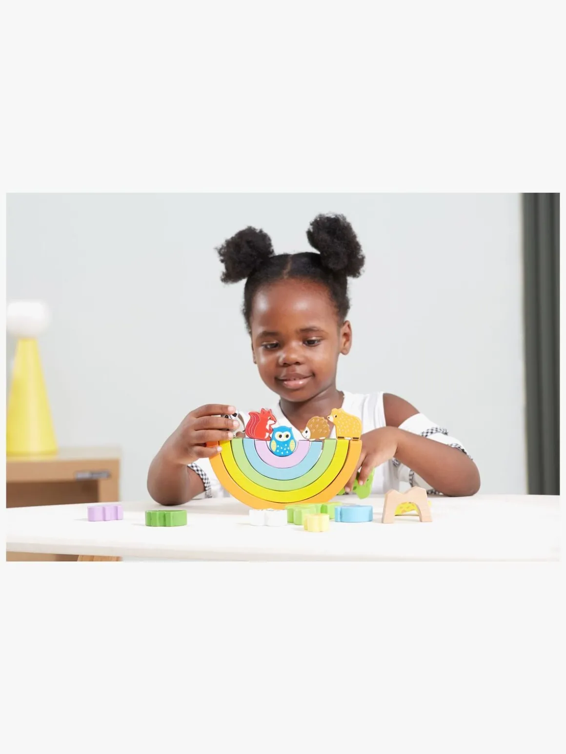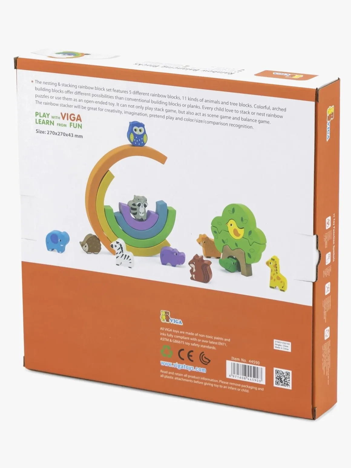 – Indeholder: 5 regnbueformede klodser, 11 dyr, 3 træformede klodser.