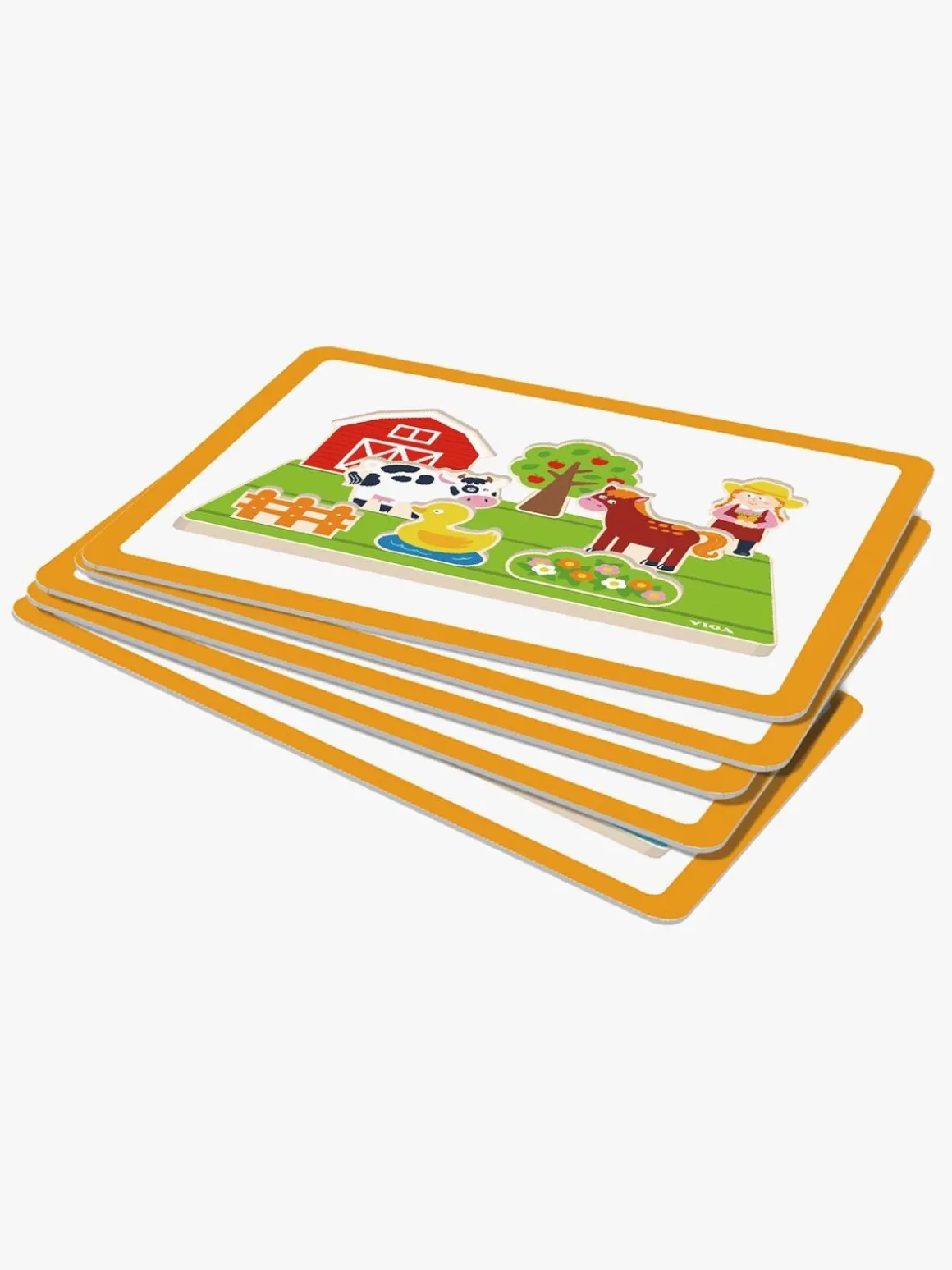 Figurerne placeres i træunderlaget, og så kan dit barn finde ud af, hvordan disse figurer forholder sig til hinanden.