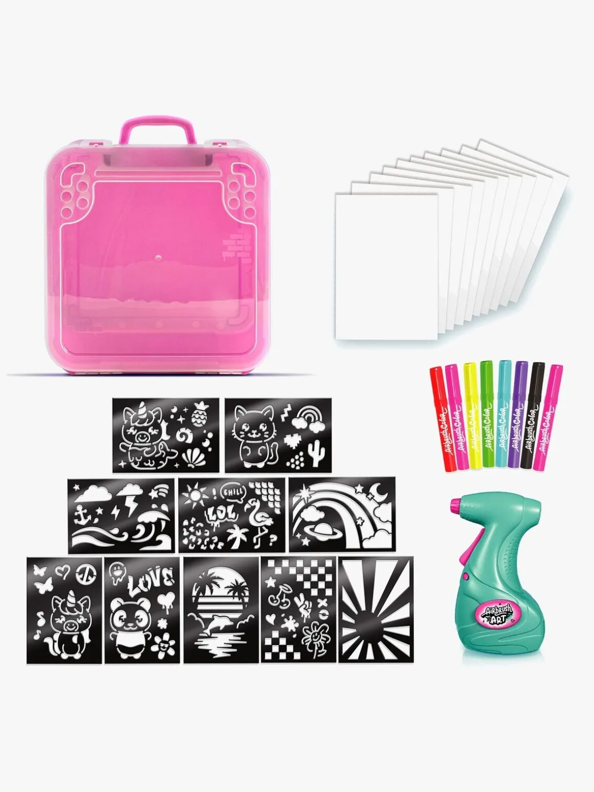 – Indeholder: 1 taske, 1 airbrush, 8 airbrushfarver, 10 stencilskabeloner, 10 papirark, 1 brugsvejledning.