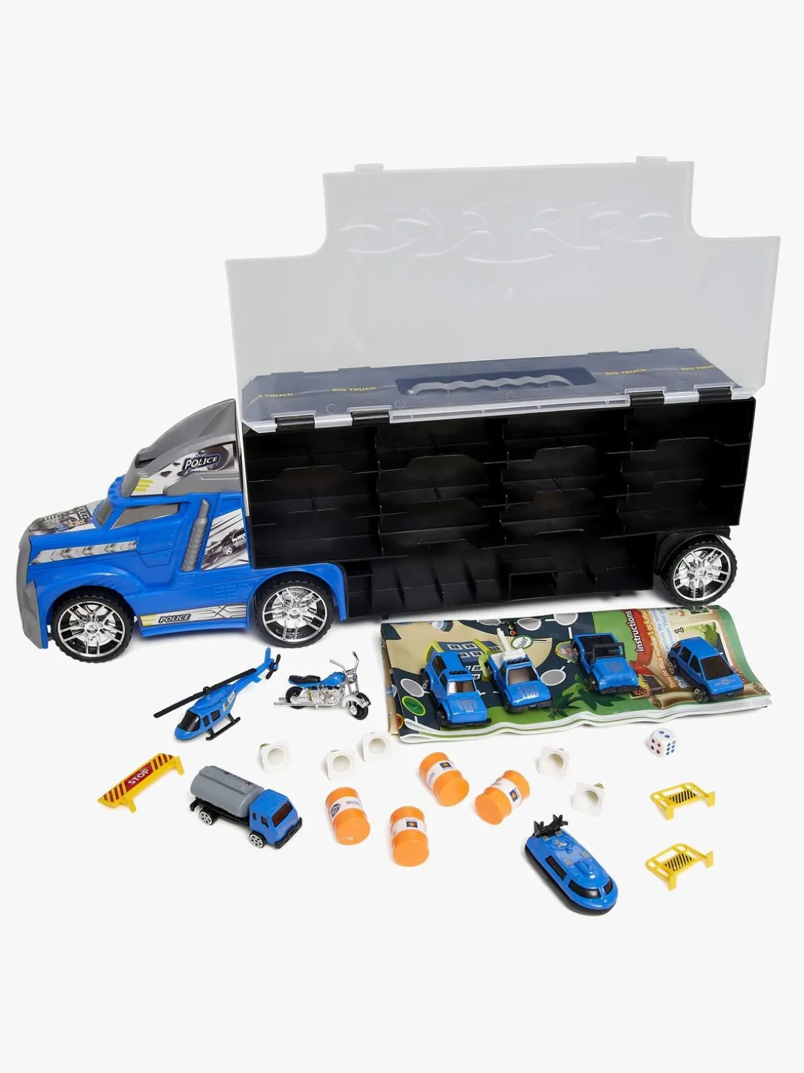 – Indeholder: 1 lastbil, 5 biler, 1 helikopter, 1 motorcykel, 1 båd, 4 kegler, 4 tønder, 3 hegn.