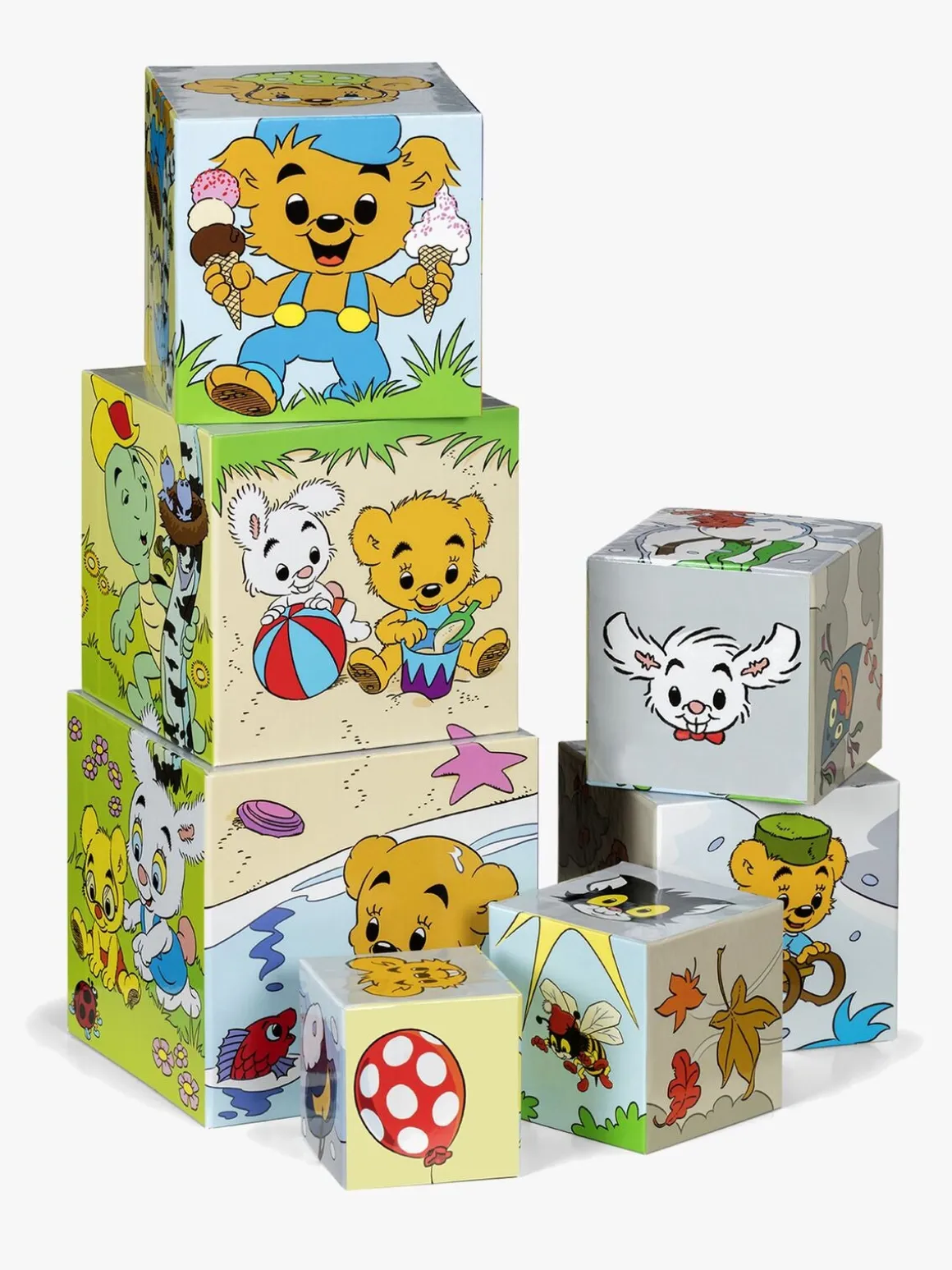 De syv klodser passer ind i hinanden, så barnet kan lære noget om størrelsesforhold. Når alle klodserne er stablede ovenpå hinanden måler tårnet 64 cm.