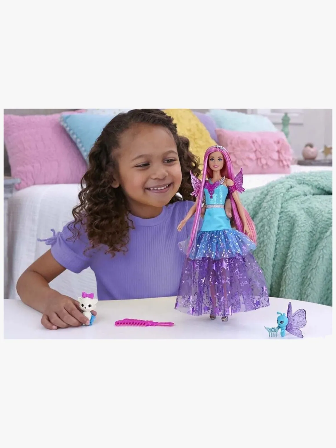 – Indeholder: 1 Barbiedukke, 1 par vinger, 2 kæledyr, 1 kam, 1 hårbånd, 1 hårsmykke.