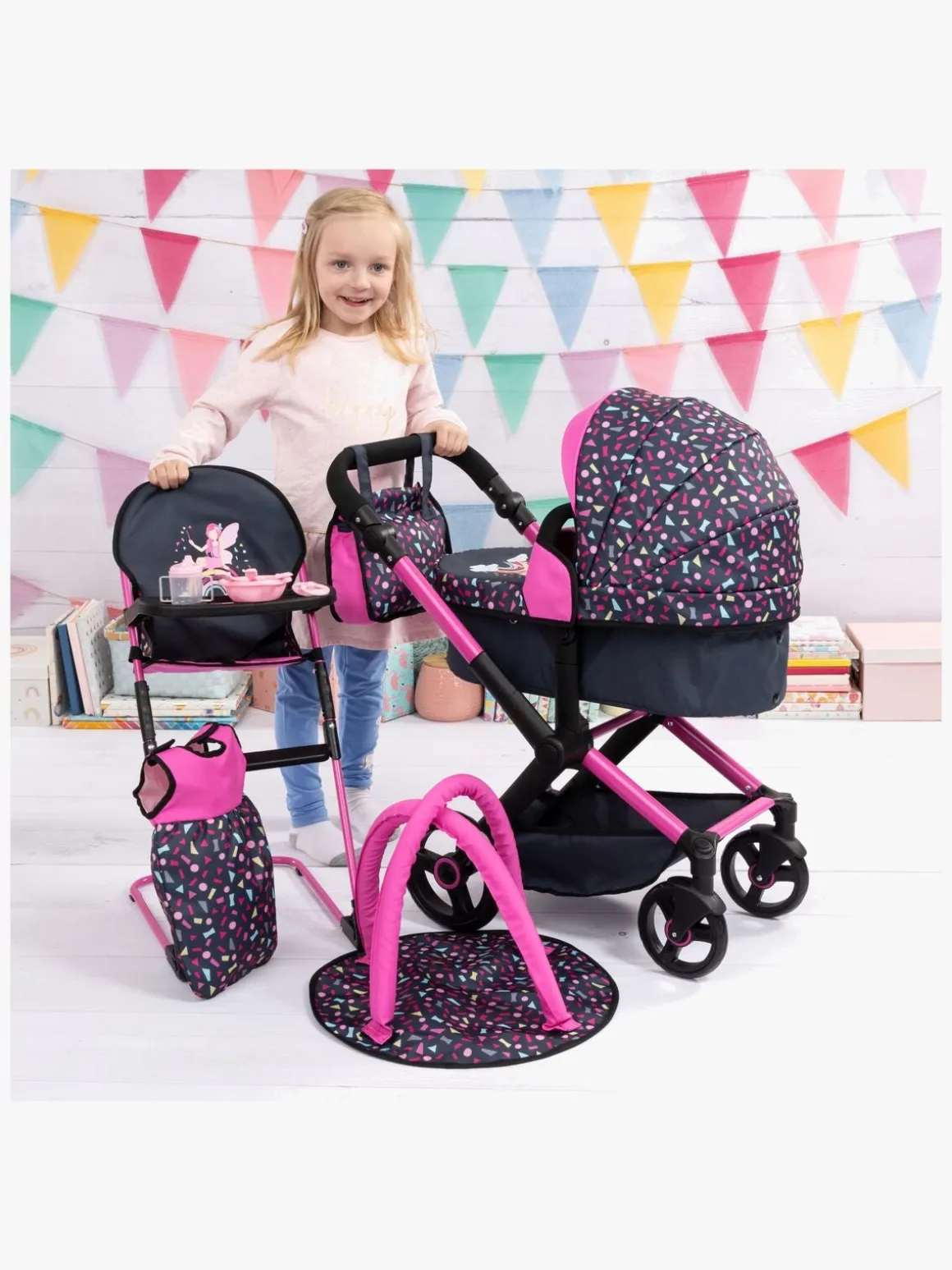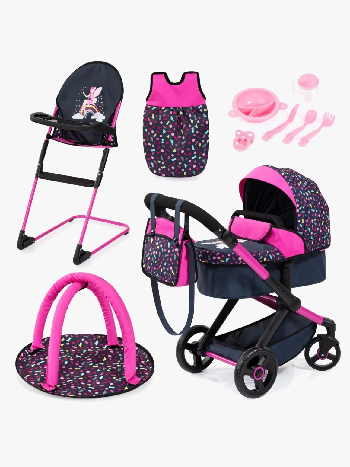 – Indeholder: 1 dukkevogn, 1 pusletaske, 1 højstol, 1 sovepose, 1 aktivitetscenter, 1 sut, 1 tallerken, 1 ske, 1 gaffel, 1 kniv, 1 tudekop.