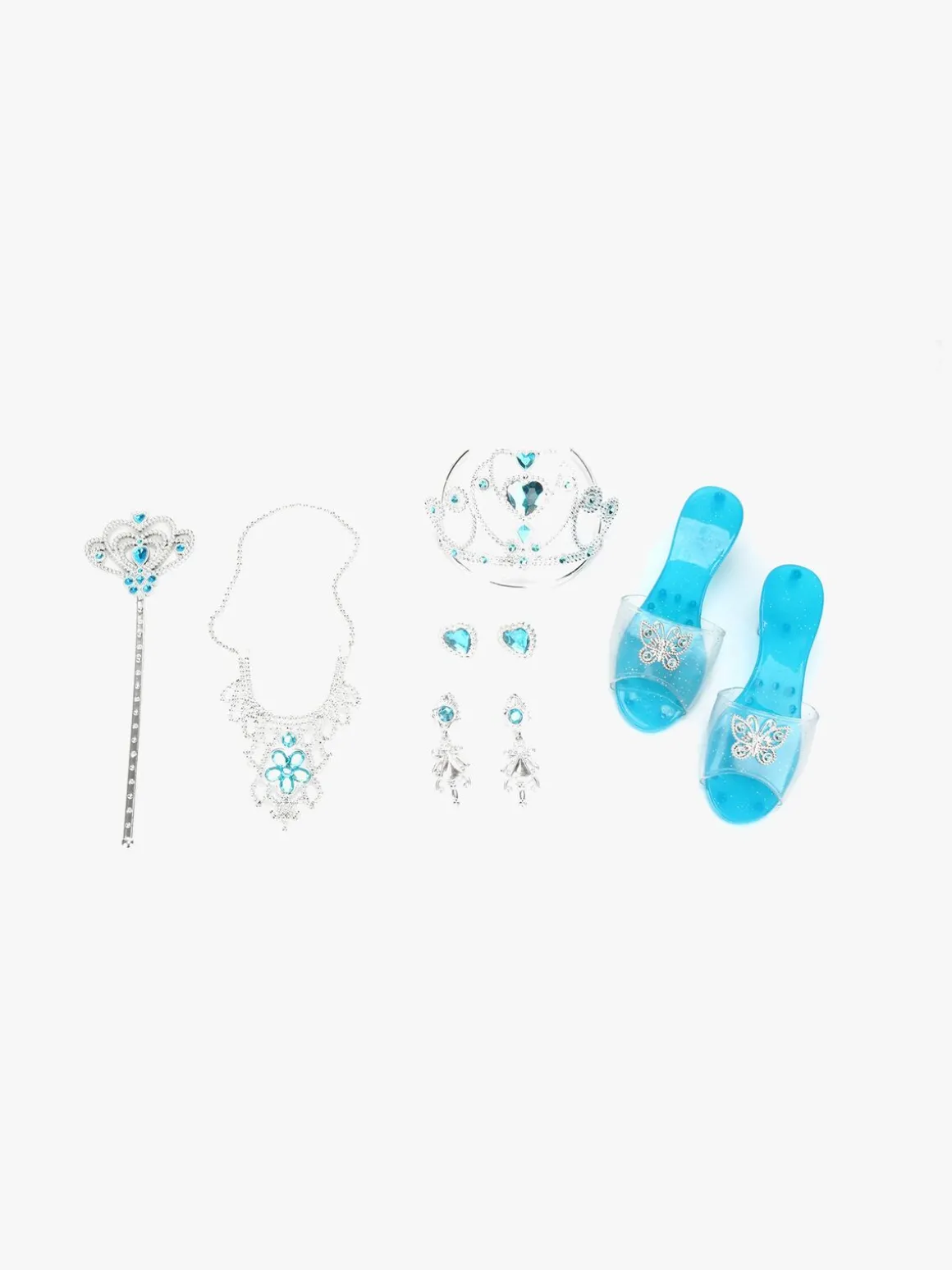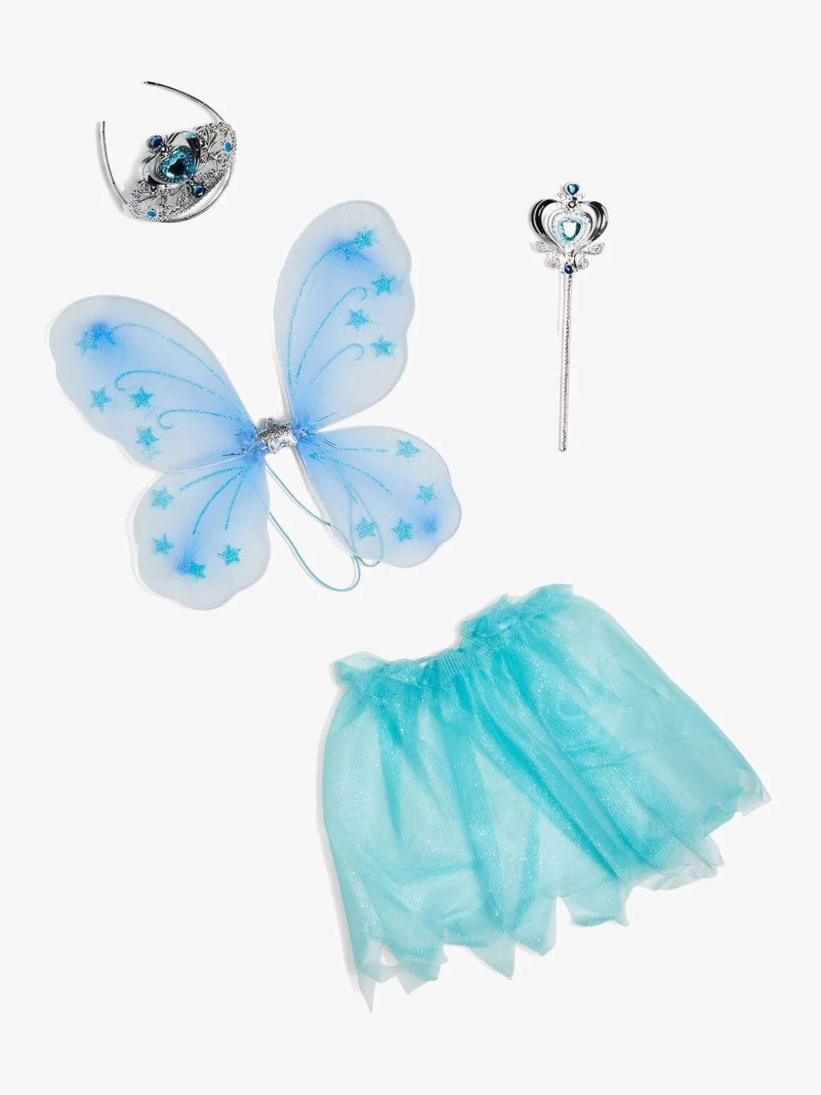 I denne pakke får du et skinnende tylskørt, fine vinger, diadem med sommerfugle og en tryllestav. Du får også en tiara og et scepter, en halskæde, øreringe og sko med sommerfugle på. Perfekt til timevis af fantasifuld leg.