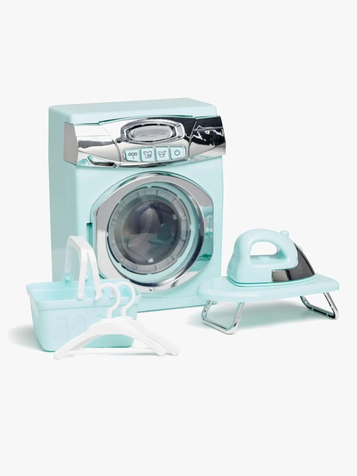 Pakken indeholder en vaskemaskine, der kommer med passende tilbehør til vasketøjet, såsom et strygejern, en strygebræt, en vaskekurv og bøjler.