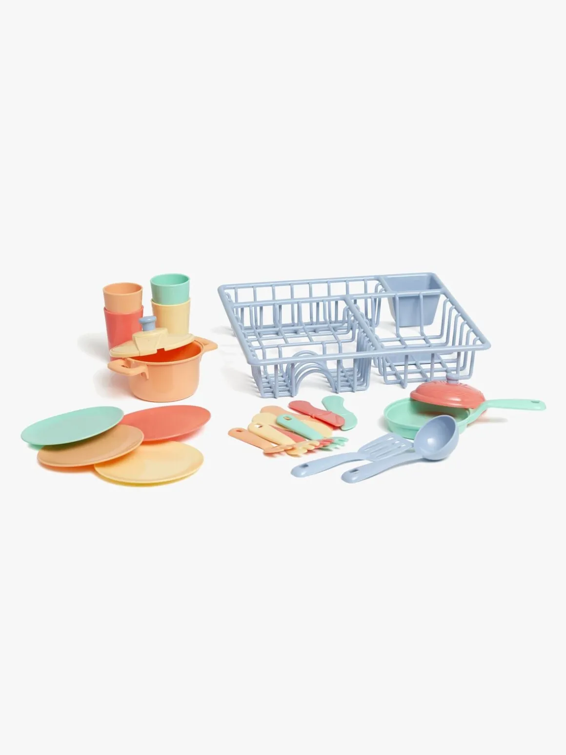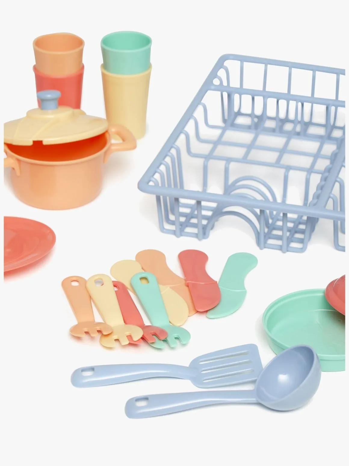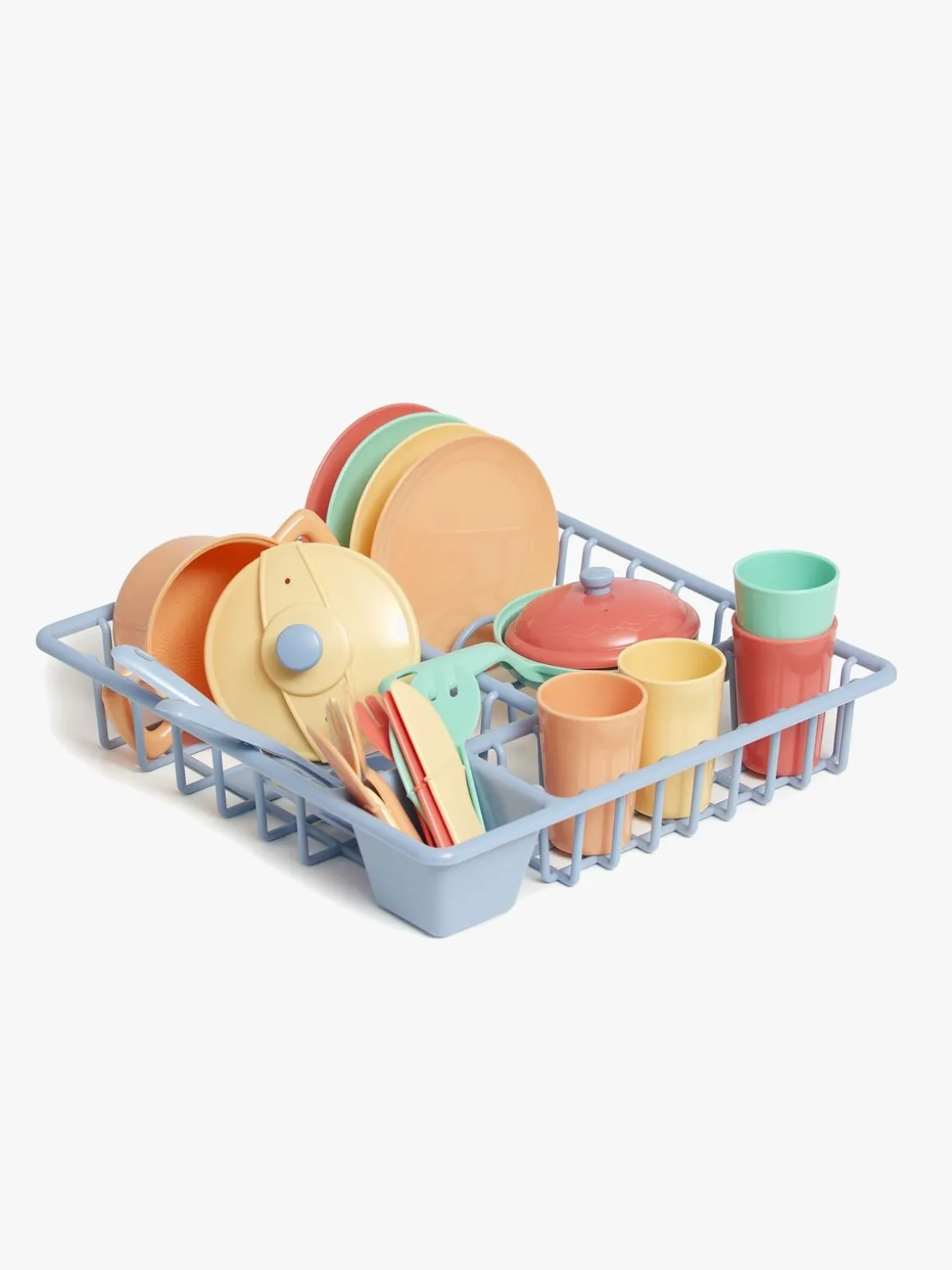 – Indeholder: 1 opvaskestativ, 4 kopper, 2 gryder, 4 tallerkener, 4 gafler, 4 knive, 2 køkkenredskaber.