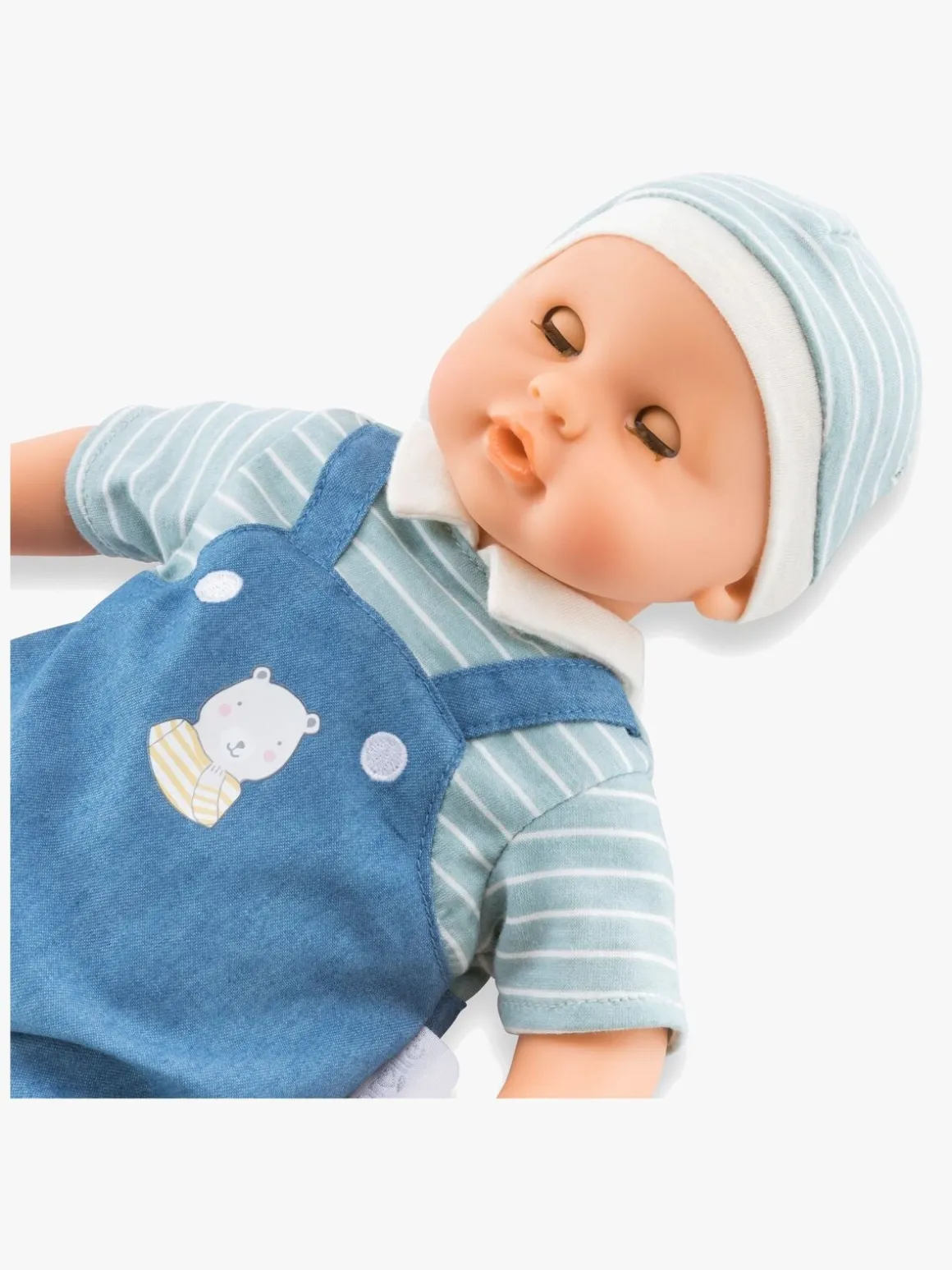 – Klædt i blå selebukser og en sød stribet t-shirt med matchende hue.