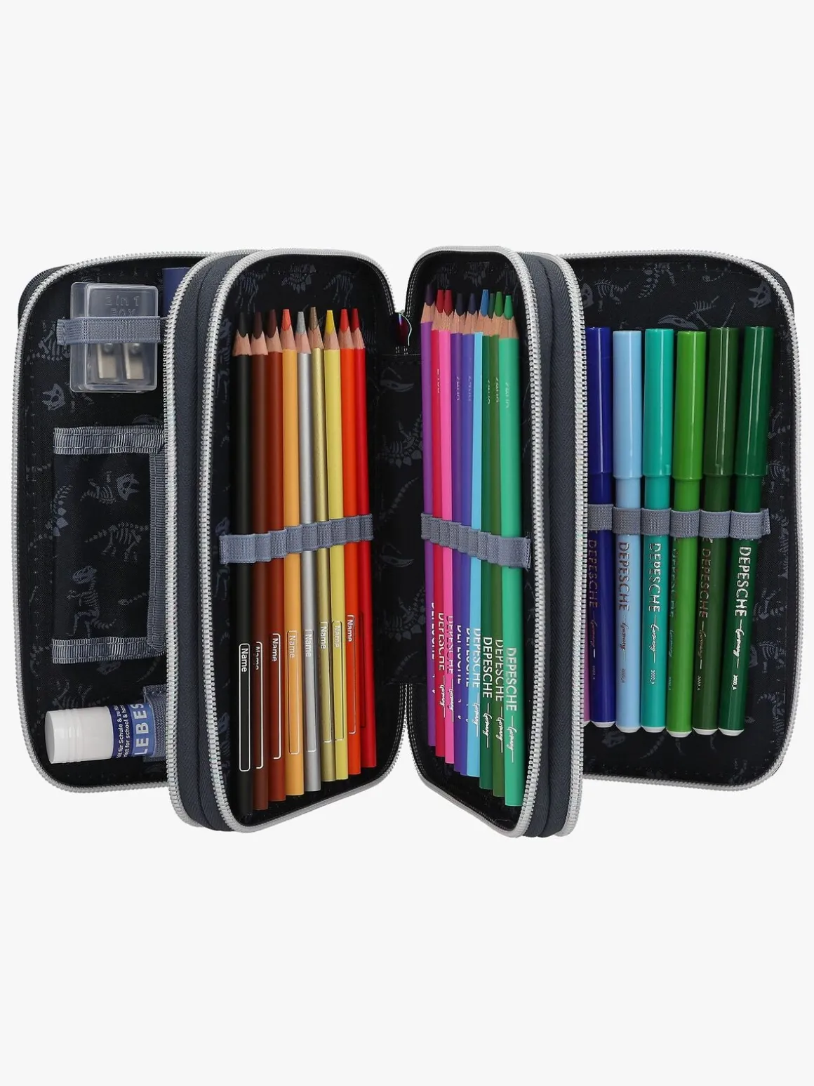 – Indeholder: 1 penalhus, 18 farveblyanter, 18 tusser, 2 blyanter, 1 saks, 1 limstift, 1 blyantspidser, 1 lineal, 1 viskelæder.