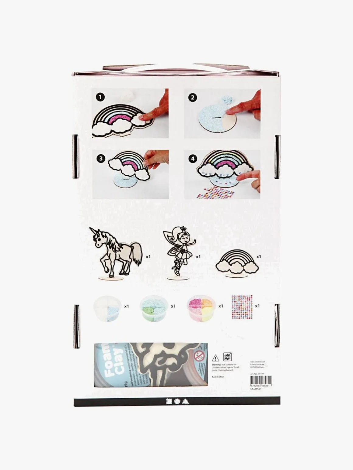 Indeholder: 3 dekorationsfigurer i træ med motiver af dekorationsgummi, Foam Clay med glitter i forskellige farver og selvklæbende rhinestones i blandede farver.
