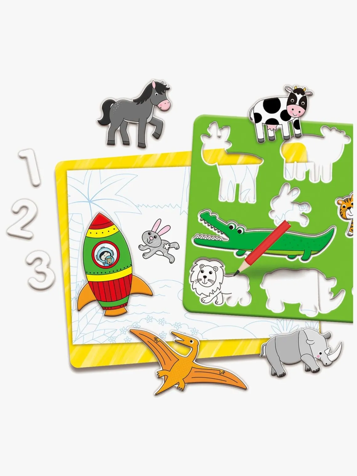 Indeholder: et tegneunderlag, 20 mønstrede papirark, 4 magnetiske skabeloner med sammenlagt 60 forskellige former.