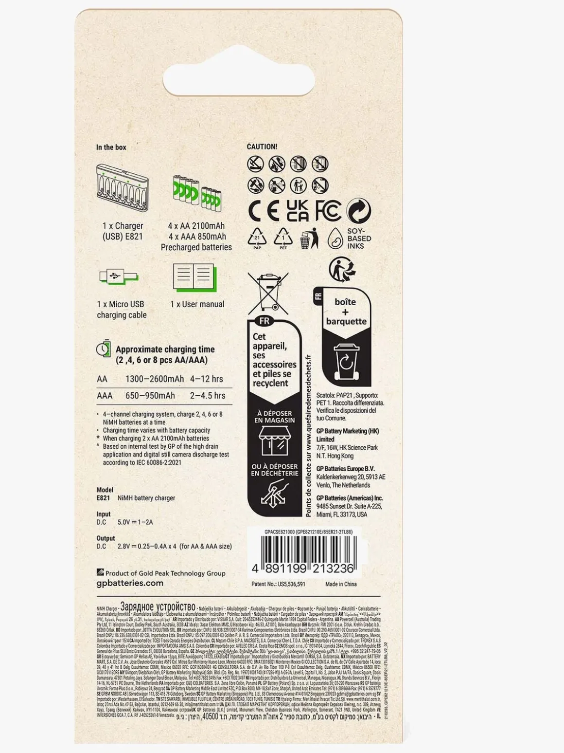 – Ladetid (2/4/6/8 batterier med indgang DC 5V/2A*): AA-batteri 1300-2600 mAh 4-12 timer, AAA-batteri 650-950 mAh 2-4,5 timer.