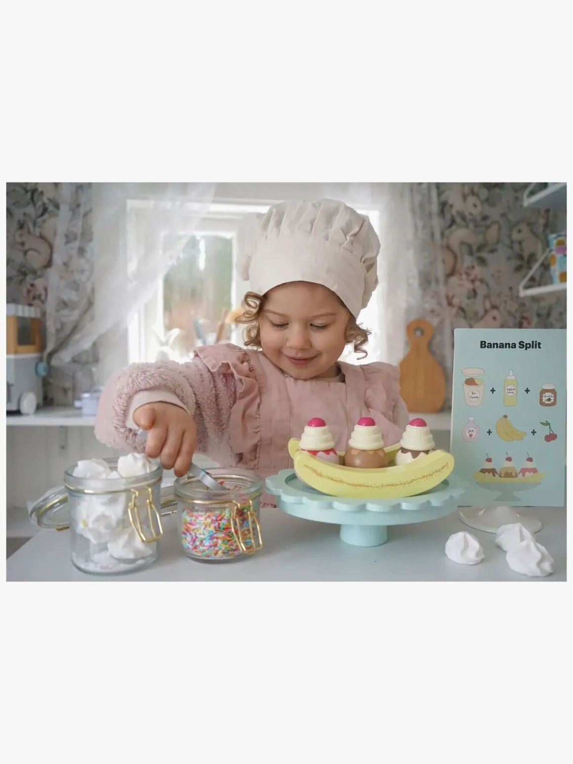 – Indeholder: 1 opskriftskort, 1 tallerken, 1 ske, 2 bananer, 3 iskugler, 3 toppe med kirsebær og flødeskum.