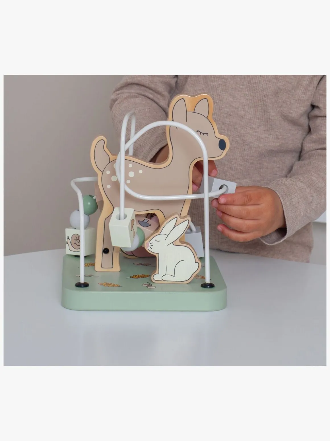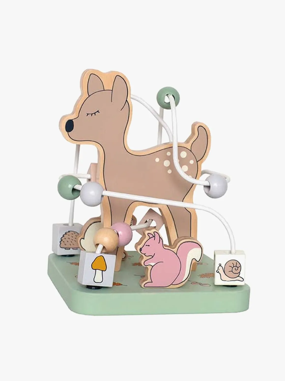En fin kuglebane i træ fra JaBaDaBaDo med form som et rådyr. Kuglebanen har forskellige søde dyr og svampe, som du kan du kan flytte rundt på. I midten af banen er der et rådyr, og rundt om sidder en lille kanin og et egern og kigger på bladene og agernene, der ligger på jorden.