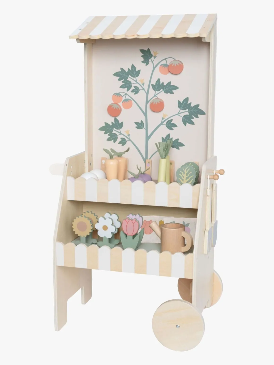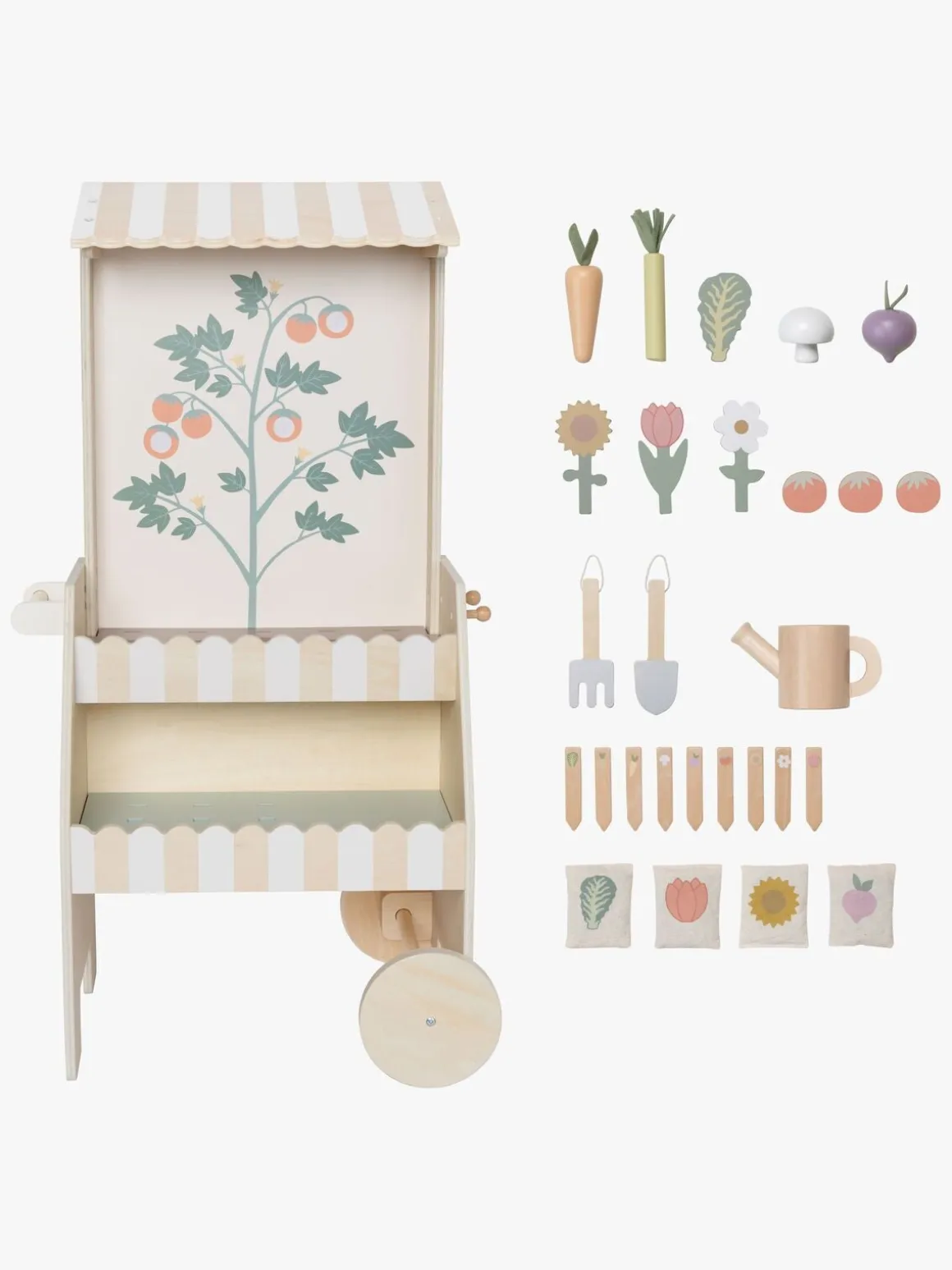 – Indeholder: 1 plantevogn, 8 plantepinde, 4 frøposer, 1 vandkande, 2 svampe, 2 gulerødder, 2 radiser, 2 tulipaner, 2 solsikker, 1 rive, 1 spade, 2 kål, 2 porrer.
