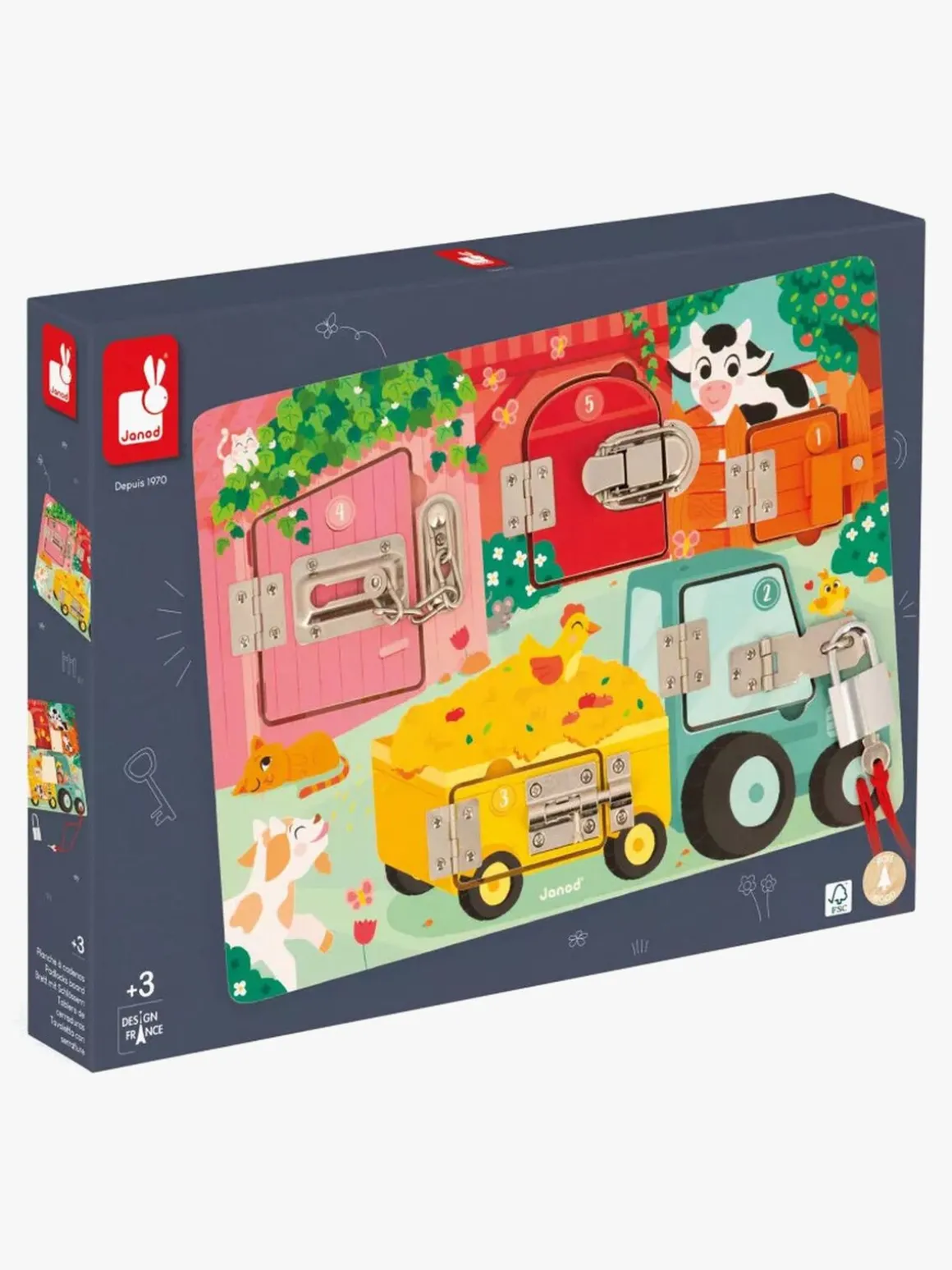 – Nøgle, haspe, dørkæde, spænde og lås.