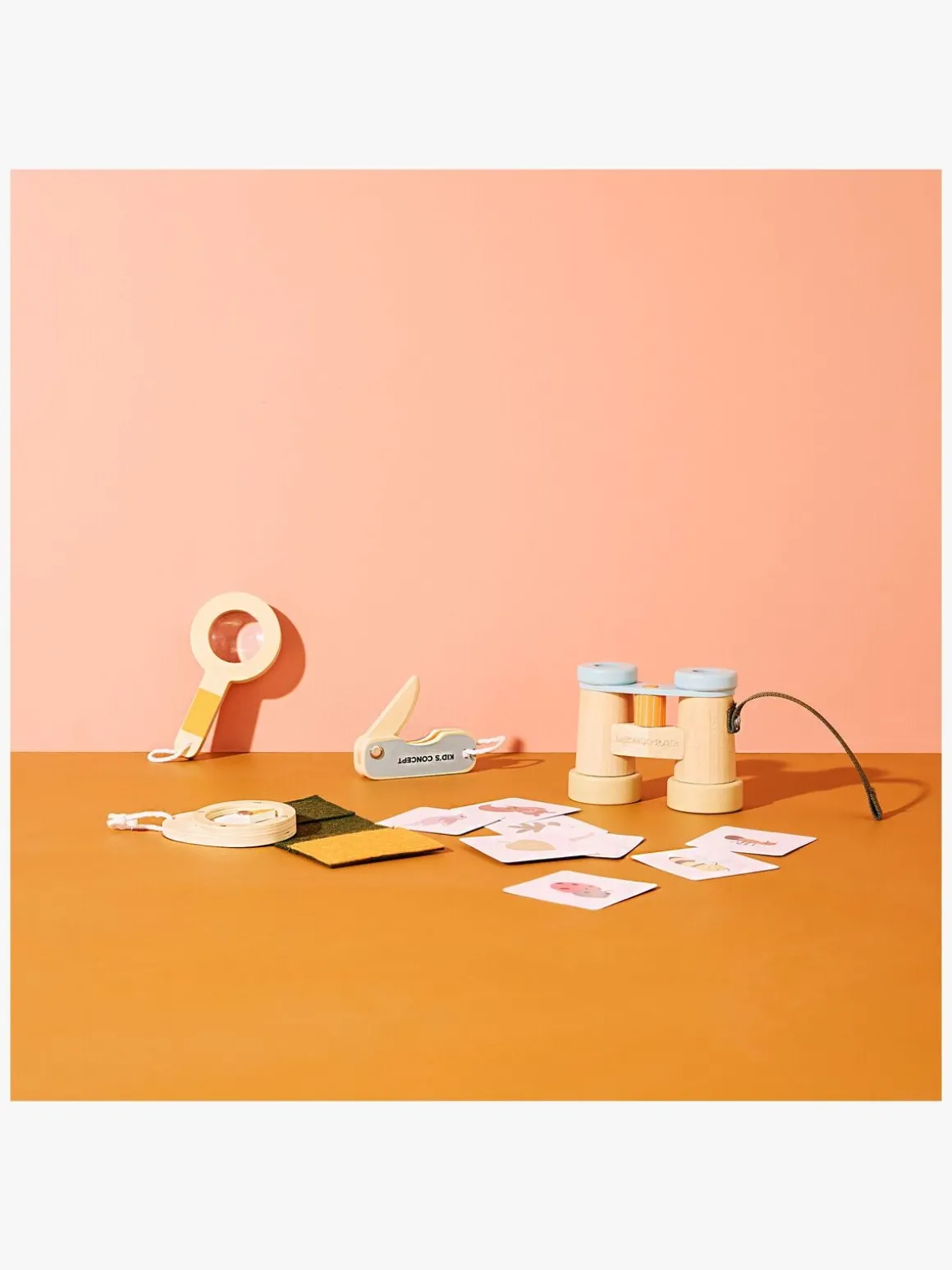– Indeholder: 1 kortholder, 1 forstørrelsesglas, 1 kikkert, 1 kompas, 1 legetøjskniv, 8 laminerede kort.