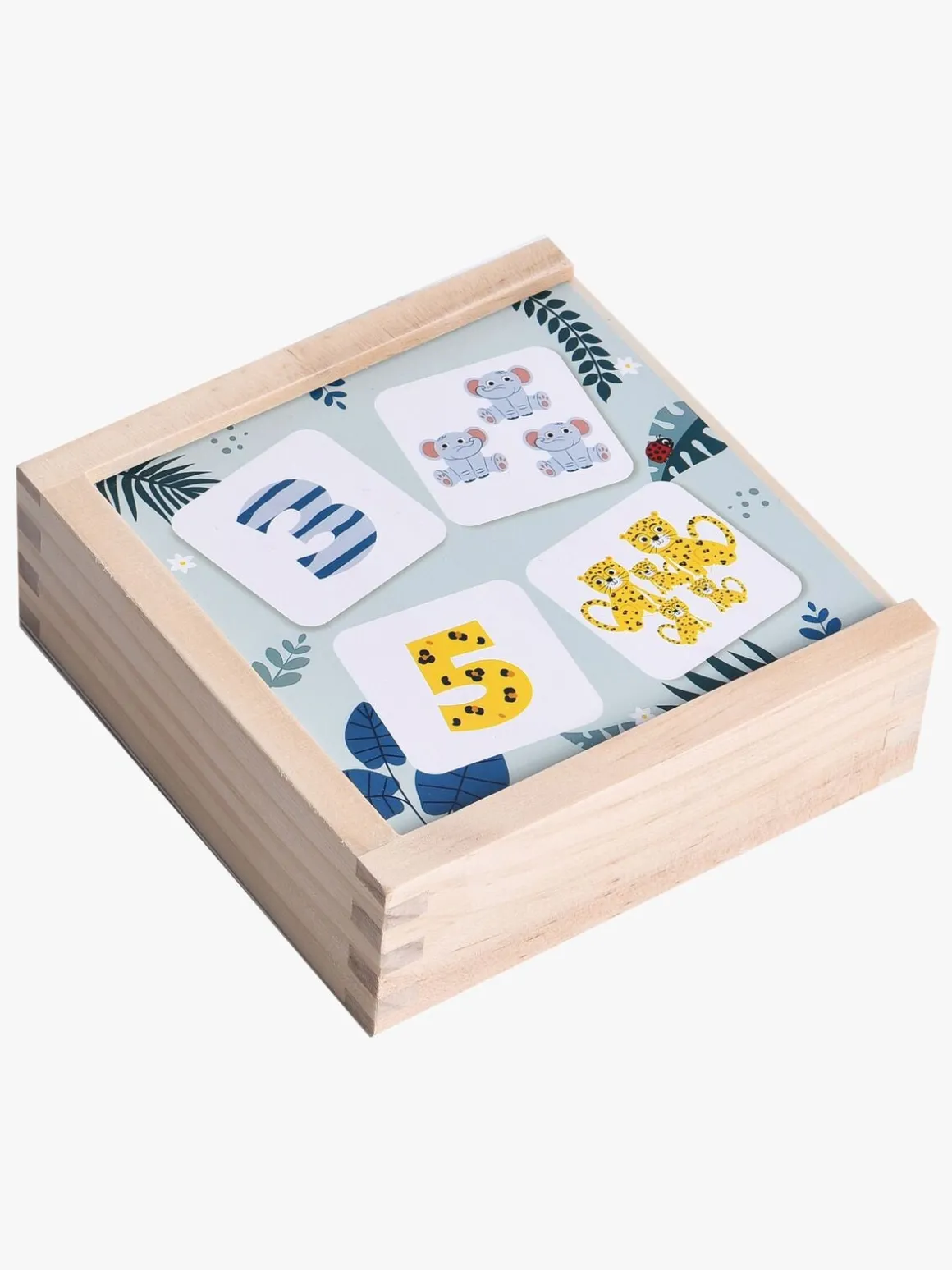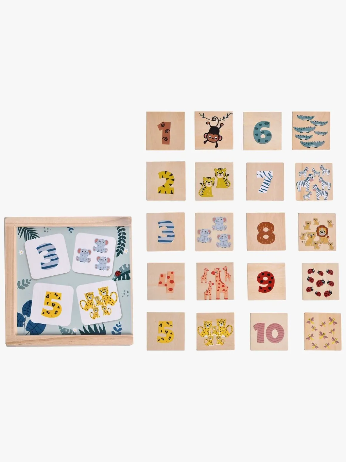 – Indeholder: 10 træbrikker med vilde dyr, 10 træbrikker med tal, 1 opbevaringskasse.
