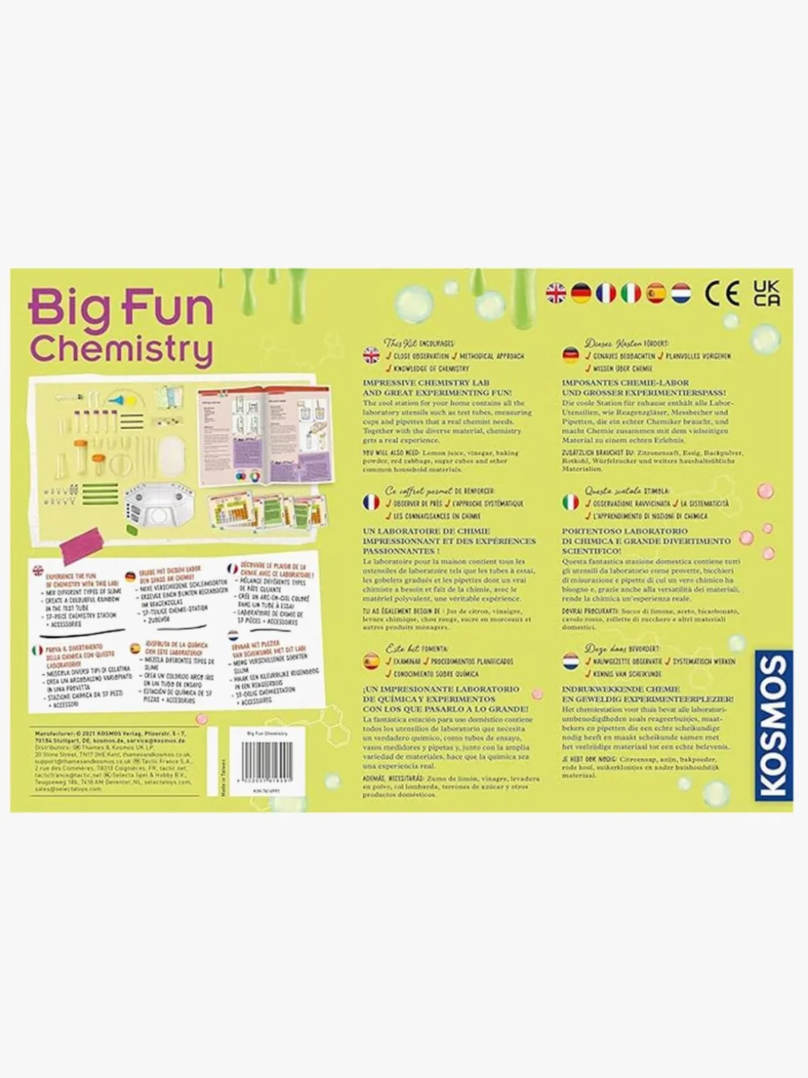 – Indeholder: eksperimentkort, kemistation, Erlenmeyer-kolbe, sprøjte, petriskål, forskellige prøverør, forskellige målebægere, pipetter, spatler, skeer, slange, filterpapir, tragt, slime, bagepulver, farvetabletter, citronsyre, brusetabletter og brugsvejledning.