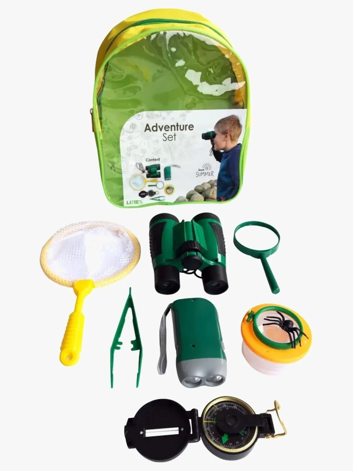 – Indeholder: 1 rygsæk, 1 kompas, 1 pincet, 1 observationsbakke, 1 forstørrelsesglas, 1 kikkert, 1 net, 1 lommelygte, 1 forstørrelsesglas.
