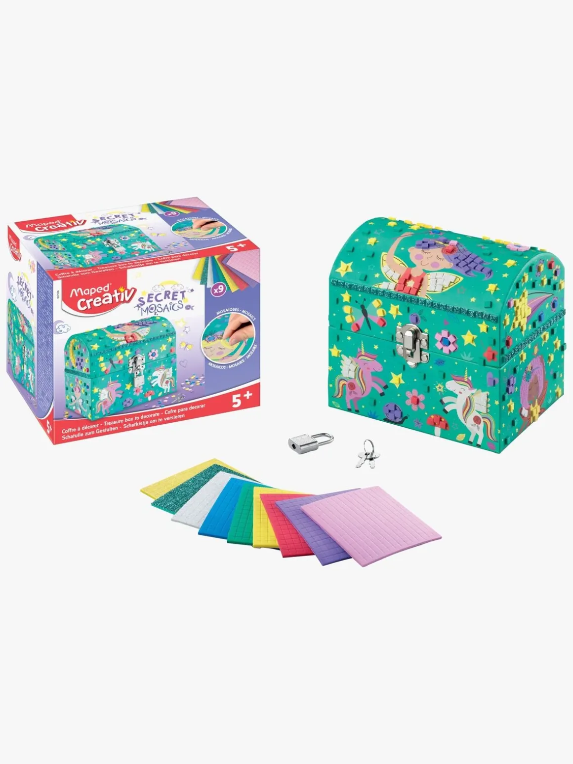 – Indeholder: 1 smykkeskrin, 9 mosaik-kreasæt, 1 hængelås.