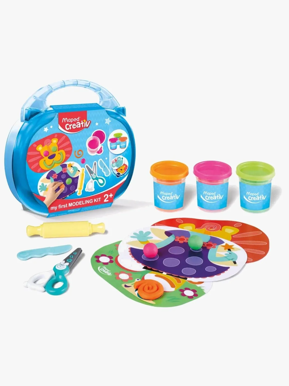 Sjovt modellervokssæt fra Maped med modellervoks i tre forskellige farver. Det har meget tilbehør og indeholder alt det, dit barn skal bruge til at skabe kreationer ud af modellervoks.