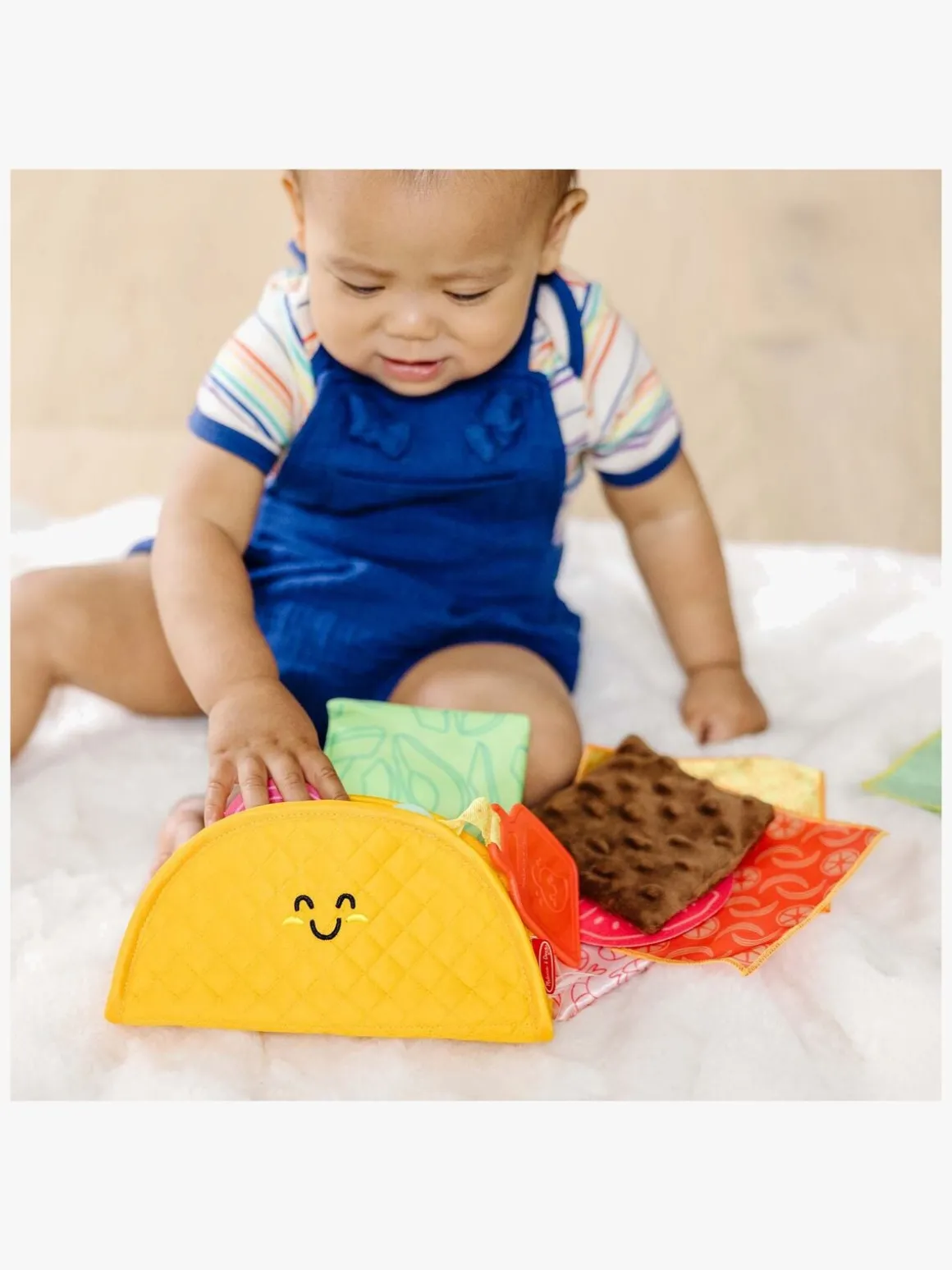 – Indeholder en blød tacoskal i skum, 3 glatte stofstykker, 3 teksturerede og krøllede stykker, 3 madformede stofstykker, 2 fastsiddende teksturerede stykker.