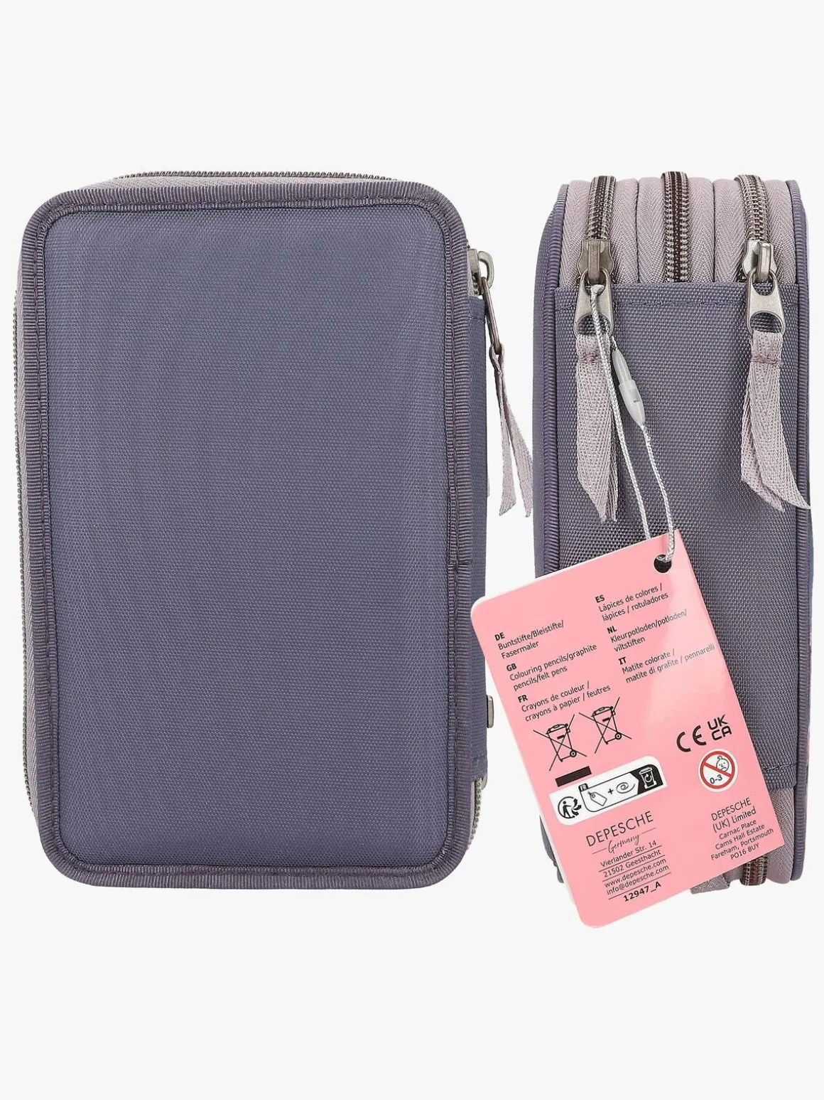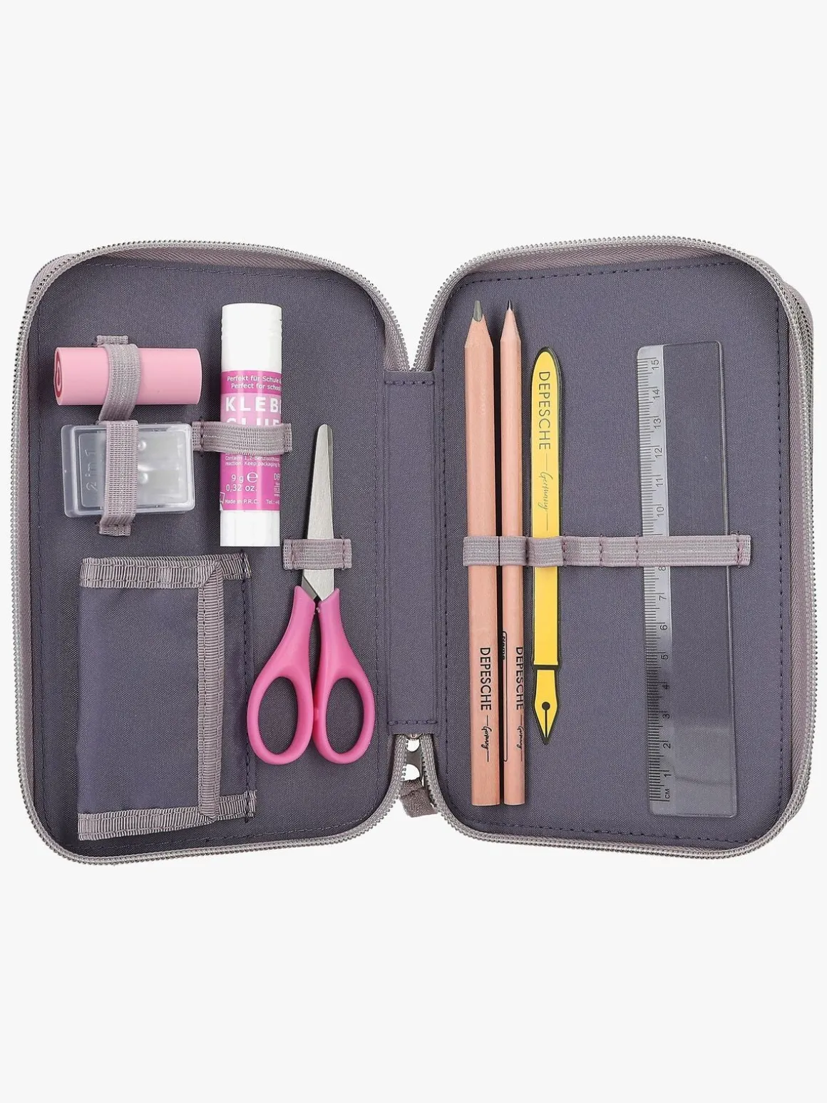 – Indeholder: 1 penalhus, 18 farveblyanter, 18 tusser, 2 blyanter, 1 saks, 1 limstift, 1 blyantspidser, 1 lineal, 1 viskelæder.
