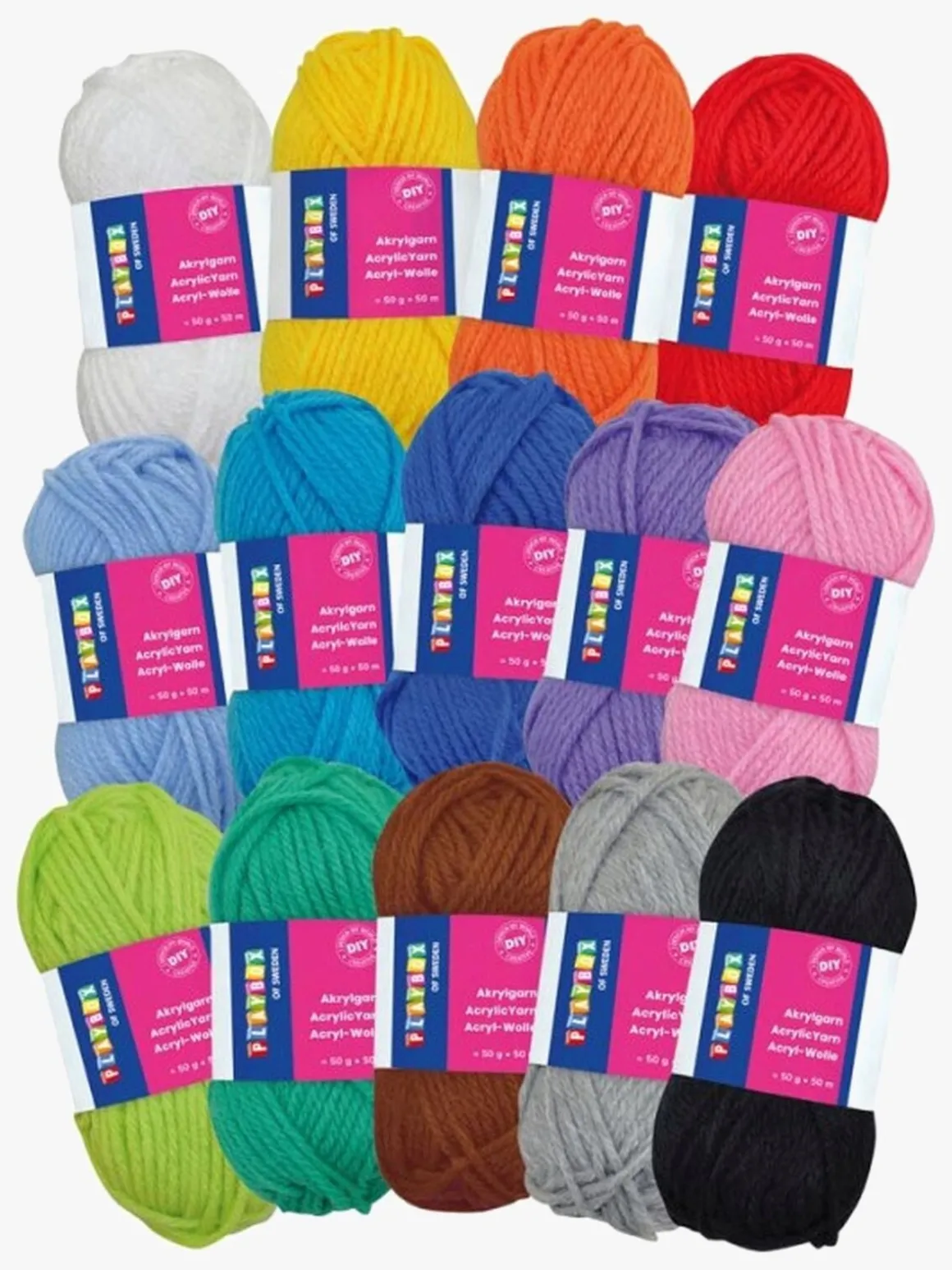 Et sæt bestående af akrylgarn i skønne farver fra Playbox. Strik, hækl, brodér og lav kreative sysler! Dette akrylgarn er af høj kvalitet og har mange praktiske egenskaber. Kommer i farverne hvid, gul, orange, rød, lilla, lyserød, lyseblå, blå, turkis, lysegrøn, grøn, brun, grå og sort. Hver rulle består af 50 meter garn.