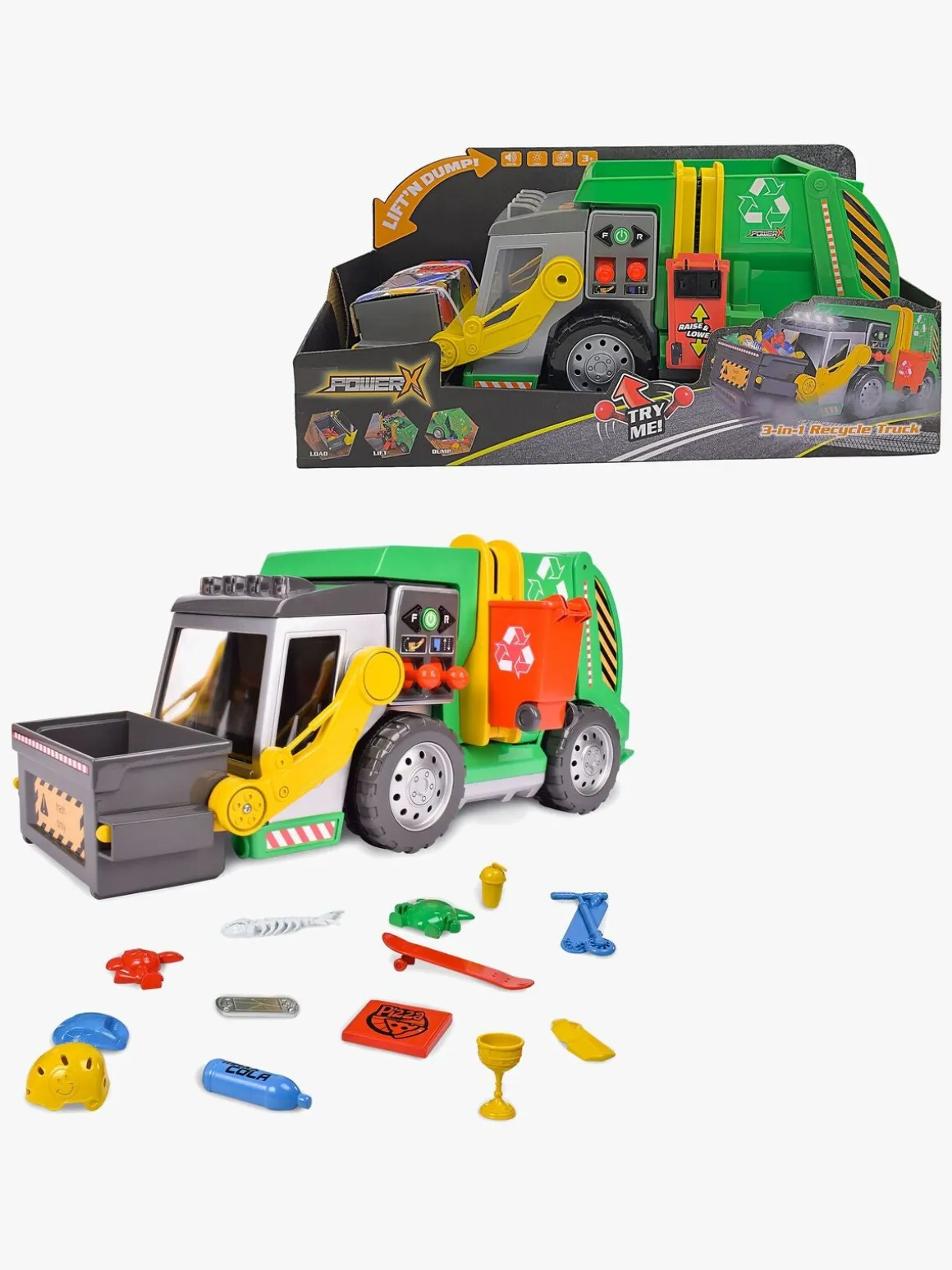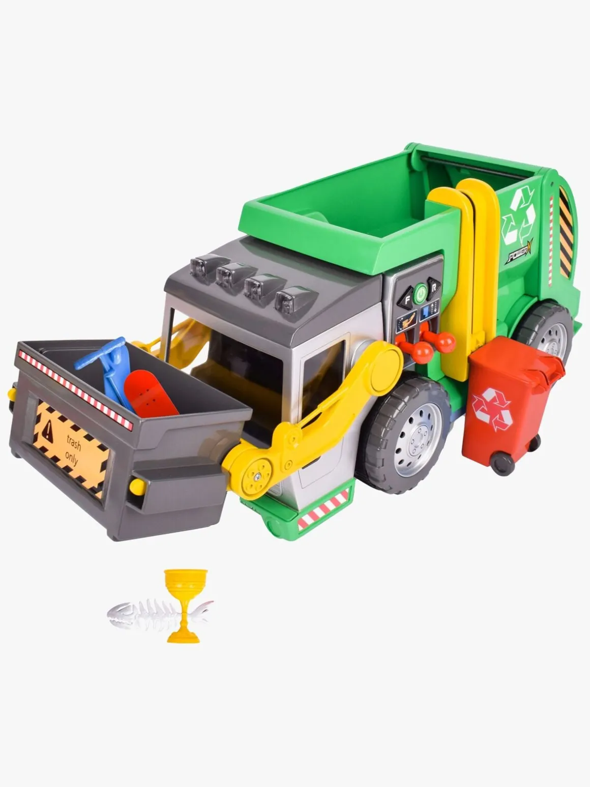 – Kan køre fremad, bakke og har dobbelt joystick til at løfte og samle skrald med!