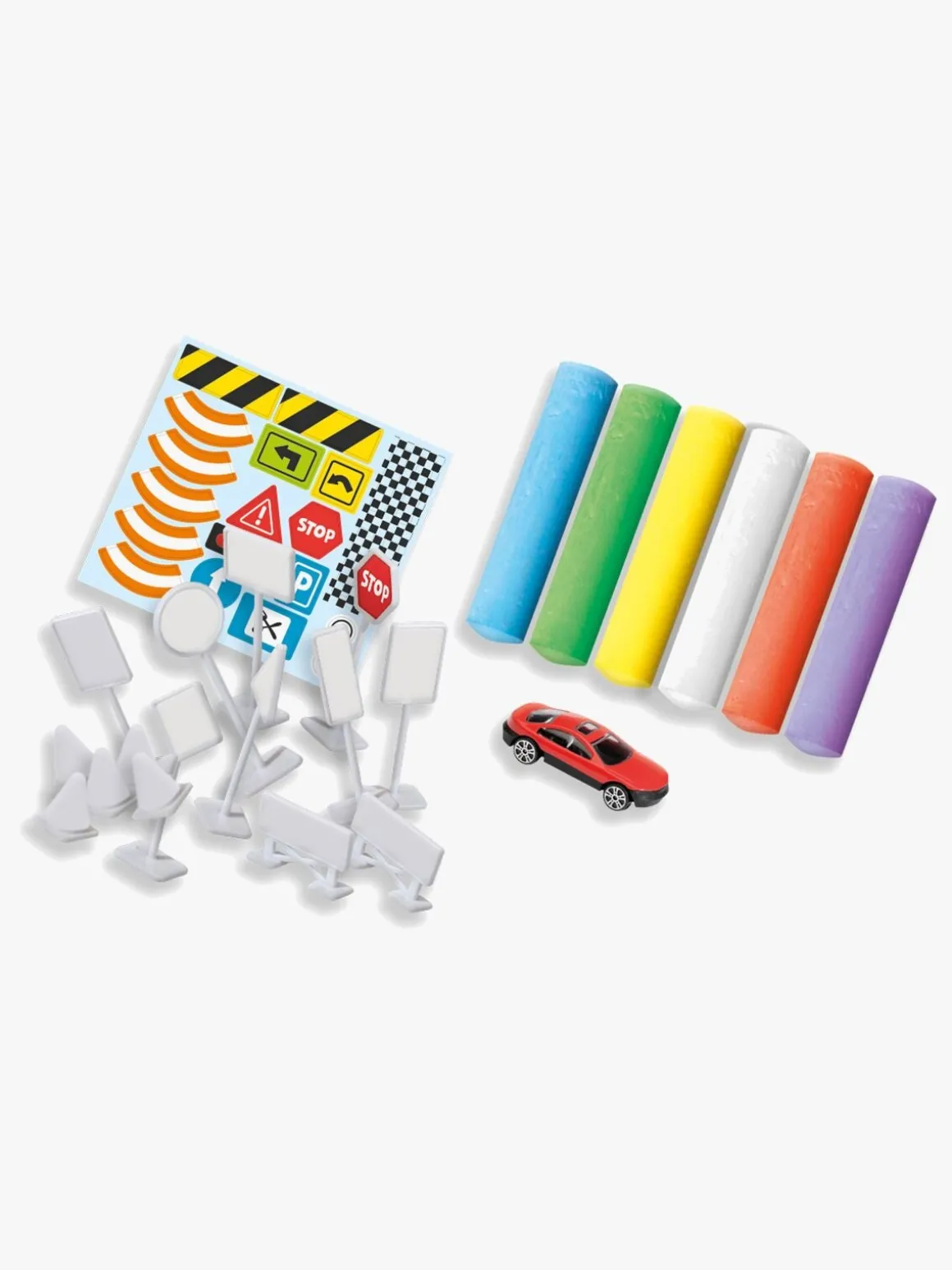 – Indeholder: 6 farvekridt, 1 bil, 15 trafikskilte, kegler og afspærringer.