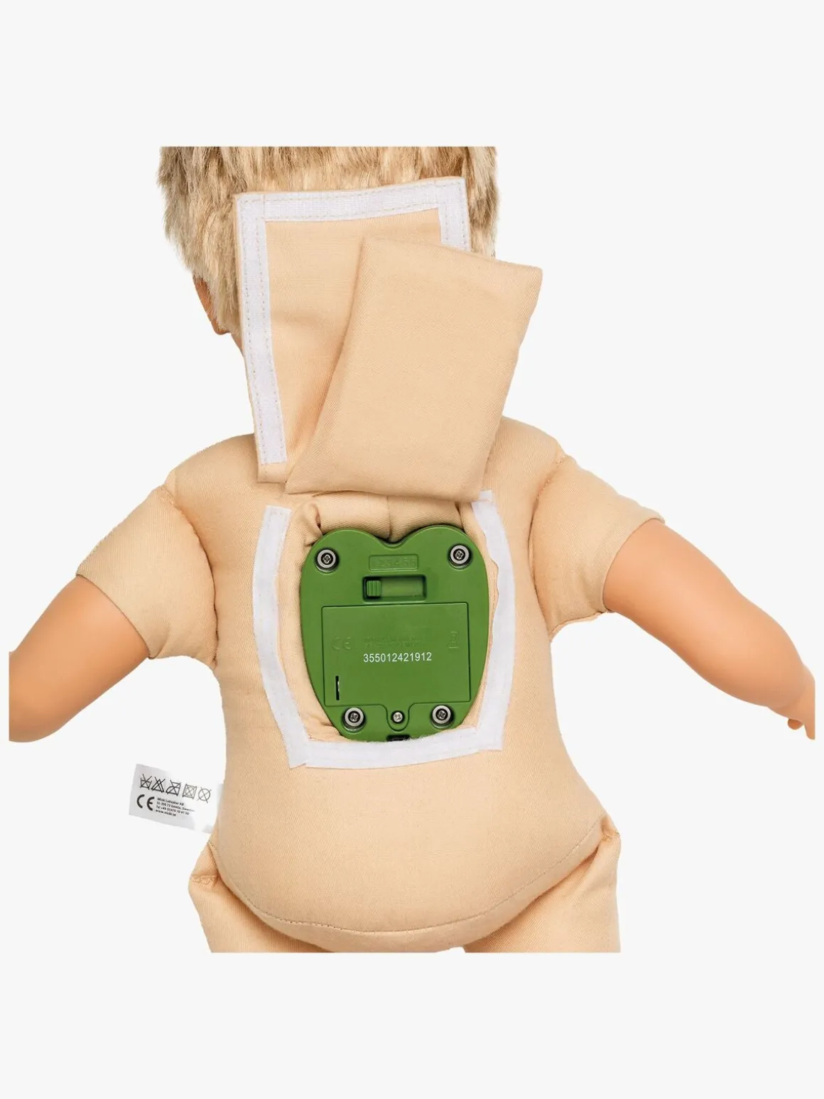 Dukken er fremstillet i bomuld og polyester, og den lukker automatisk øjnene, når du lægger den på ryggen. Plastikdelene i dukken er fremstillet af PVC, fri for ftalater og bisfenol.
