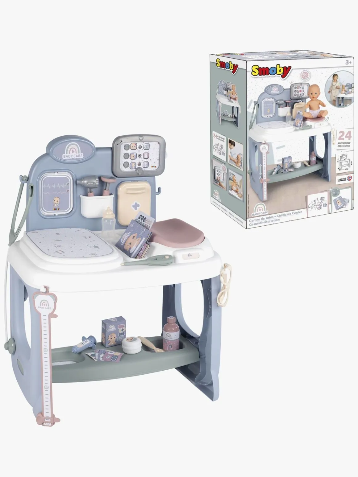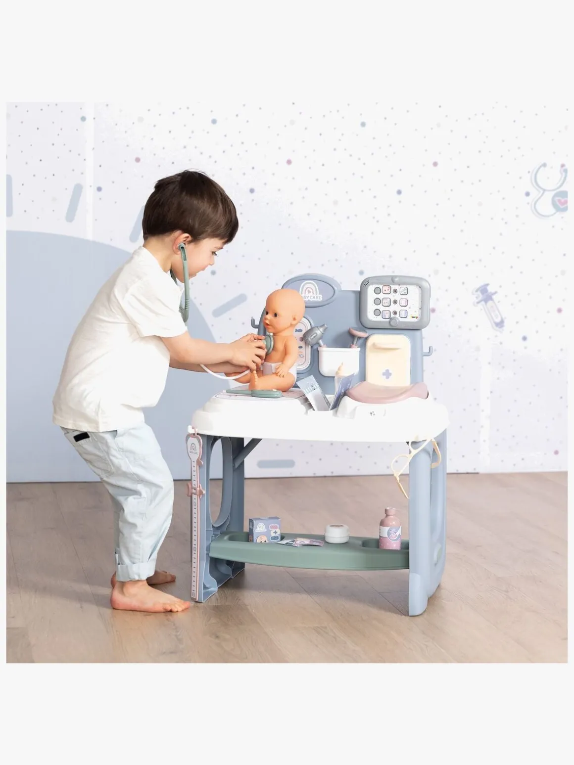 – Indeholder: 1 vægt, 1 stetoskop, 1 termometer, 1 reflekshammer, 1 førstehjælpskasse, 1 otoskop, 1 sundhedsjournal, 1 lægekontor.
