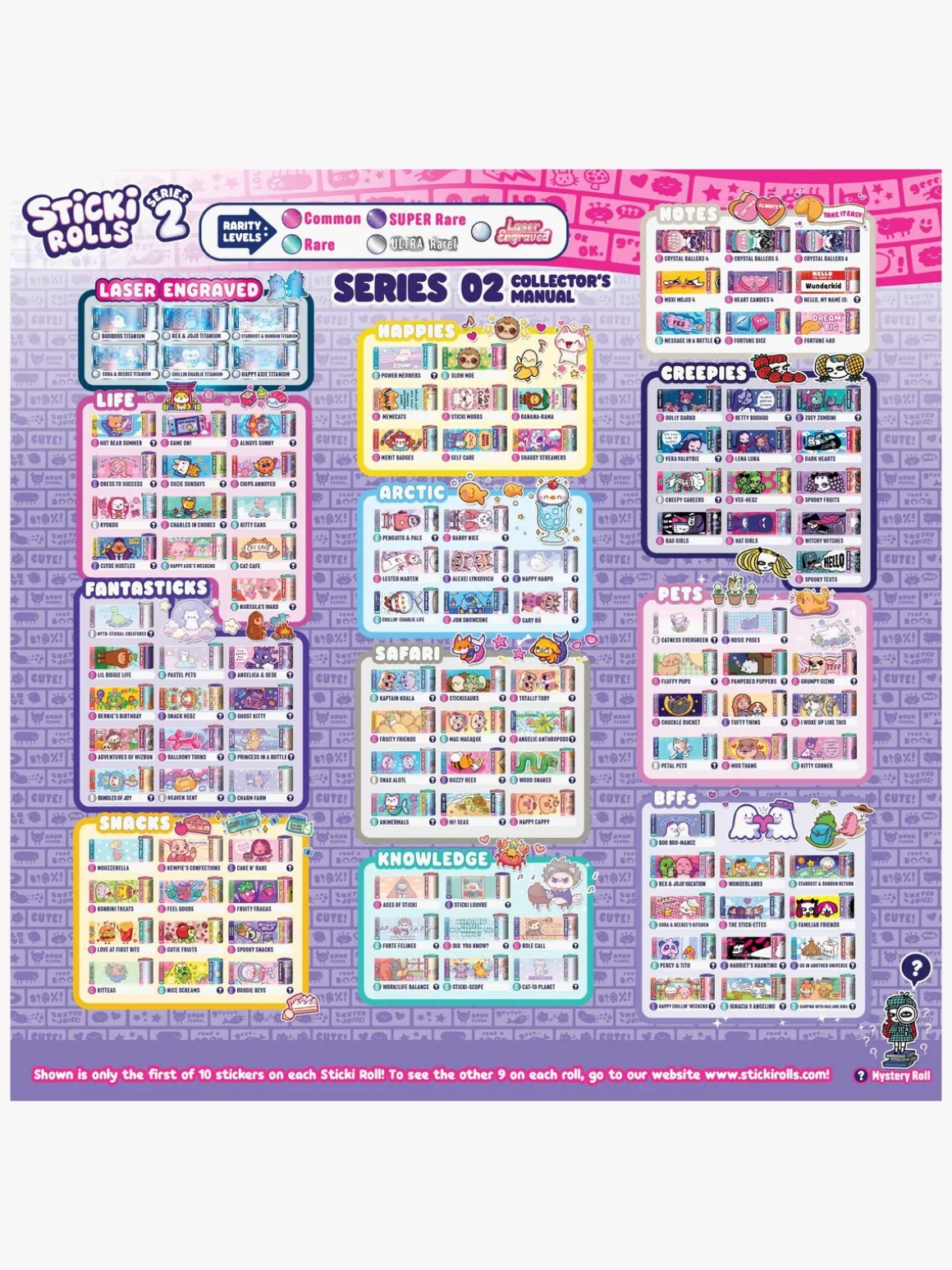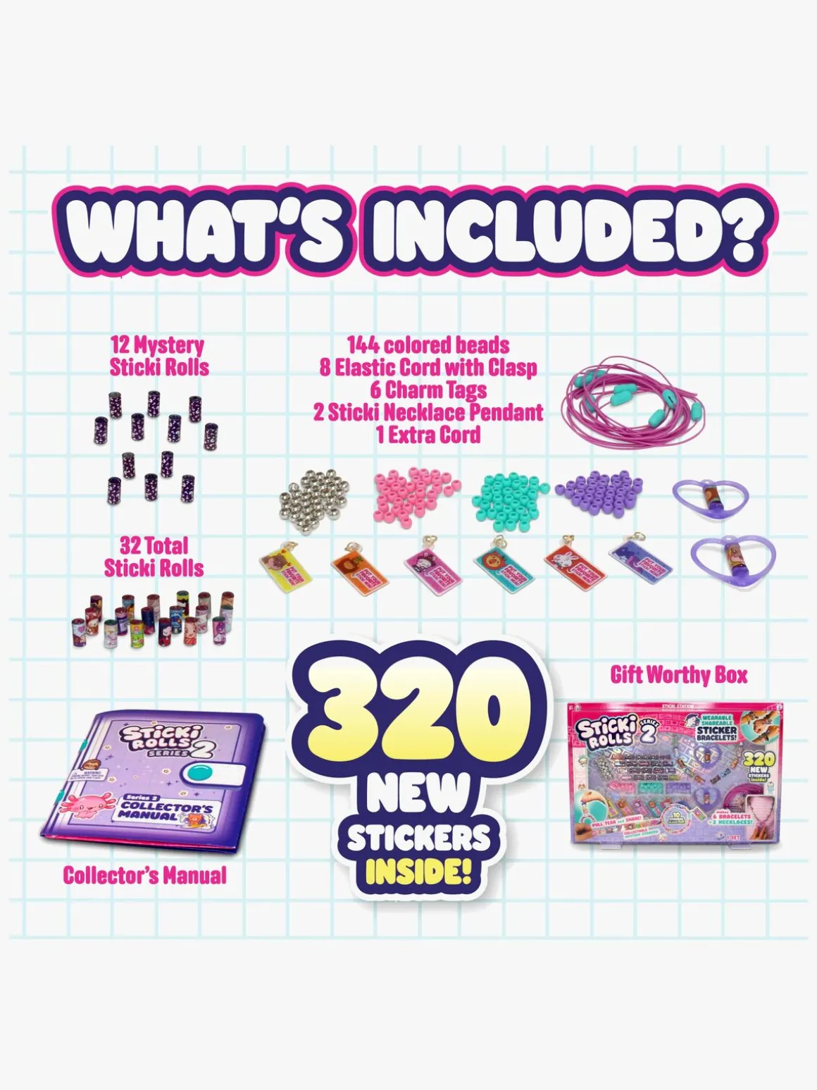 – Indeholder: 320 klistermærker, 144 perler, 32 ruller, 1 samlerguide, 1 samleralbum.