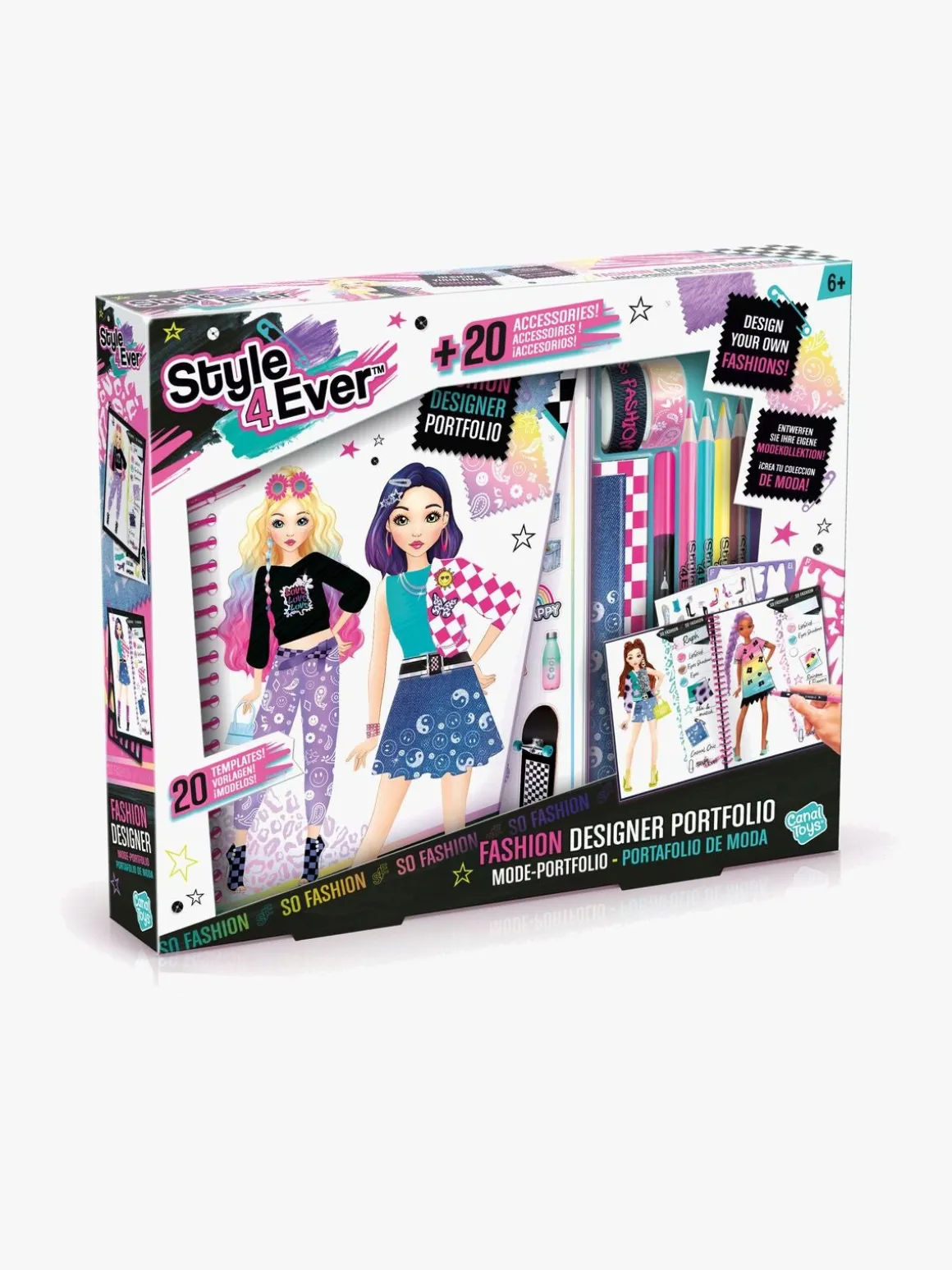 – Indeholder: 1 notesblok, 3 skabeloner, 4 farvekridt, 2 stofark, 2 papirruller, 5 mønsterark, 1 limstift, 1 instruktionsbog, 1 tus.