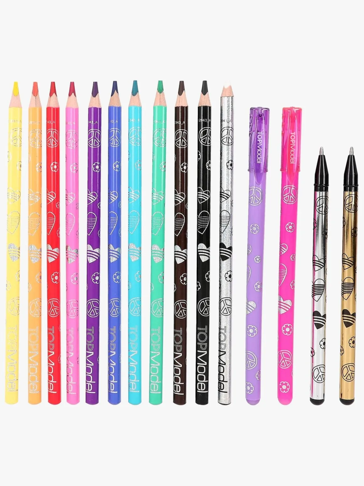 – Indeholder: 1 designbog, 10 farveblyanter, 4 gelépenne, 1 viskelæder, 2 klistermærkeark.