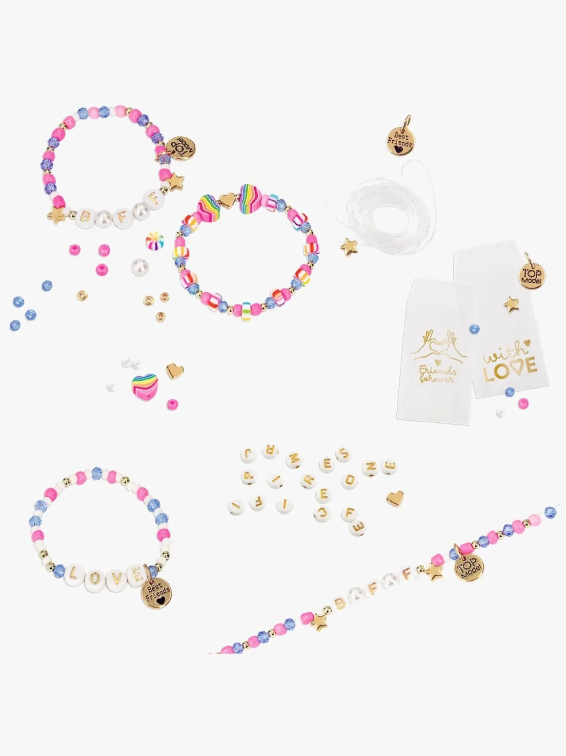 – Indeholder: Farverige perler, bogstavperler, metalcharms, elastisk smykketråd og brugsvejledning.