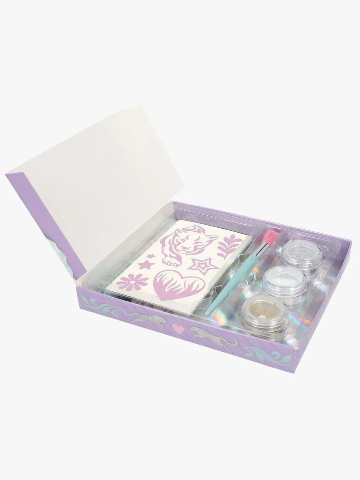 – Indeholder 43 tatoveringer, 3 glitterfarver og 1 pensel.