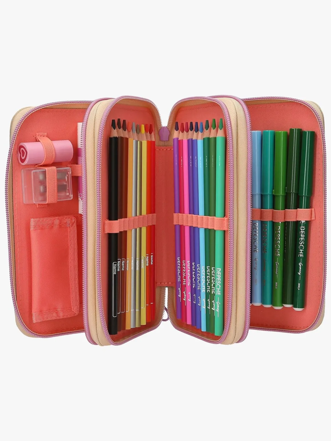 – Indeholder: 1 penalhus, 18 farveblyanter, 18 tusser, 2 blyanter, 1 saks, 1 limstift, 1 blyantspidser, 1 lineal, 1 viskelæder.