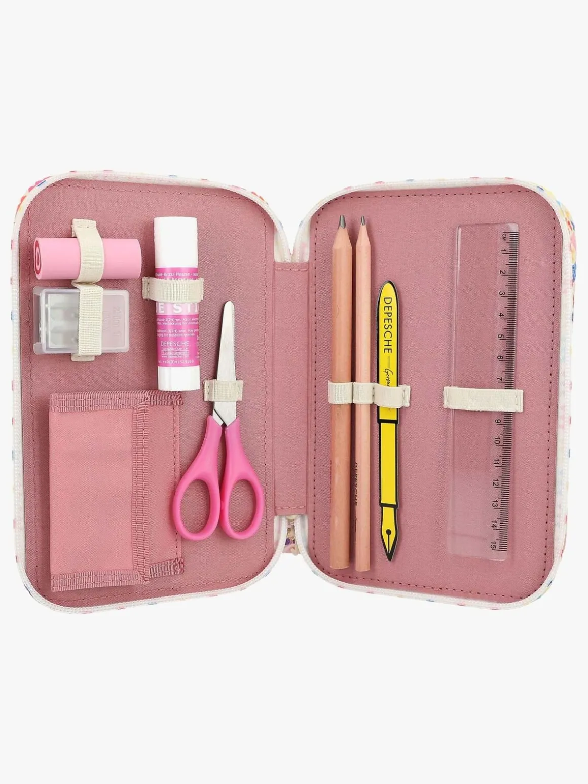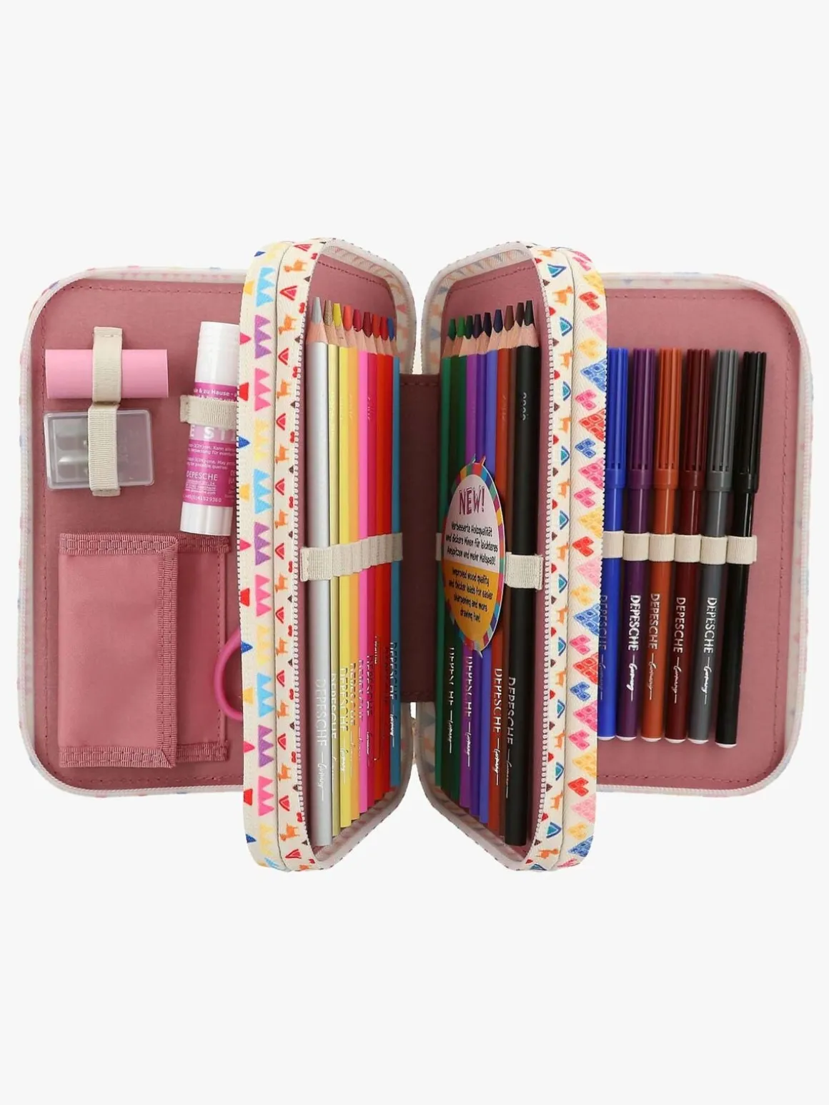 – Indeholder: 18 farveblyanter, 18 filttusser, 1 viskelæder, 2 blyanter, 1 saks, 1 limstift, 1 lineal, 1 blyantspidser.