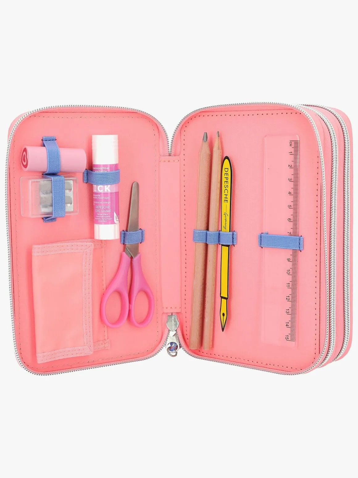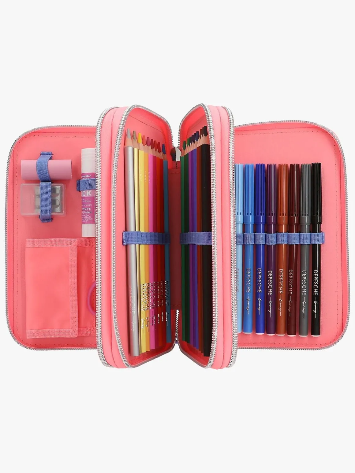 – Indeholder: 1 penalhus, 18 farveblyanter, 18 tusser, 2 blyanter, 1 saks, 1 limstift, 1 blyantspidser, 1 lineal, 1 viskelæder.