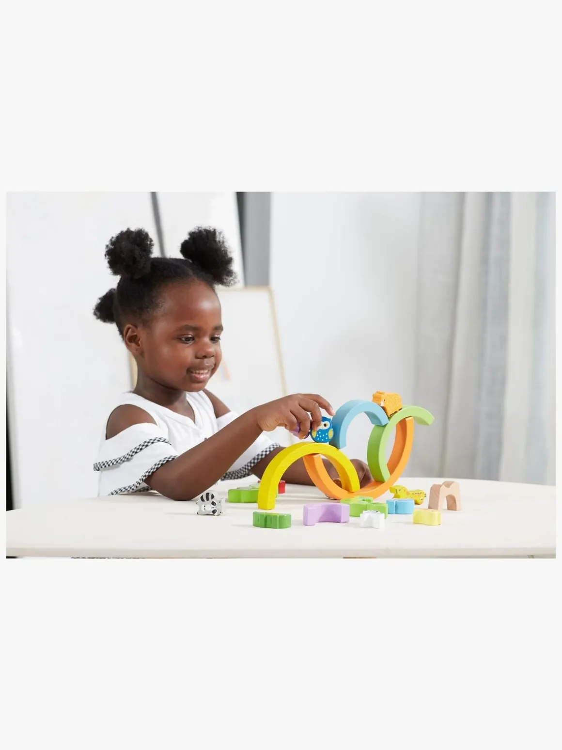 – Indeholder: 5 regnbueformede klodser, 11 dyr, 3 træformede klodser.
