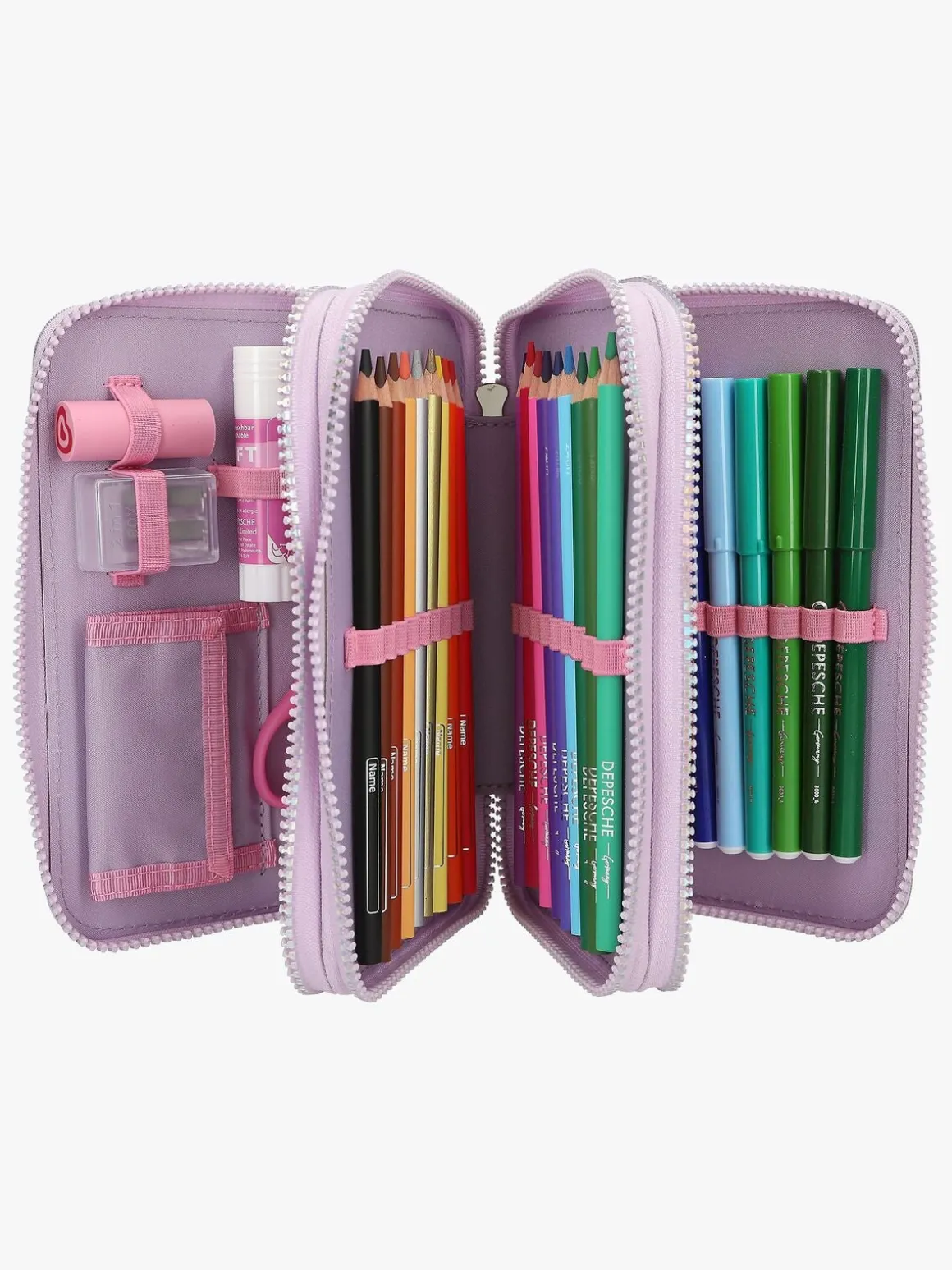 – Indeholder: 1 penalhus, 18 farveblyanter, 18 tusser, 2 blyanter, 1 saks, 1 limstift, 1 blyantspidser, 1 lineal, 1 viskelæder.